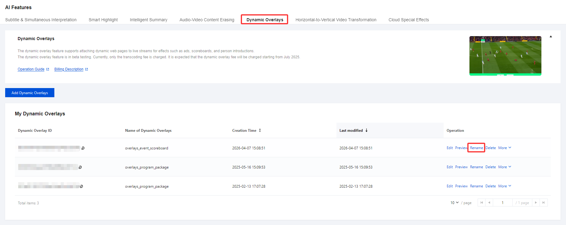 2. In the overlay list, select the corresponding dynamic overlay based on your business requirements and click Rename.