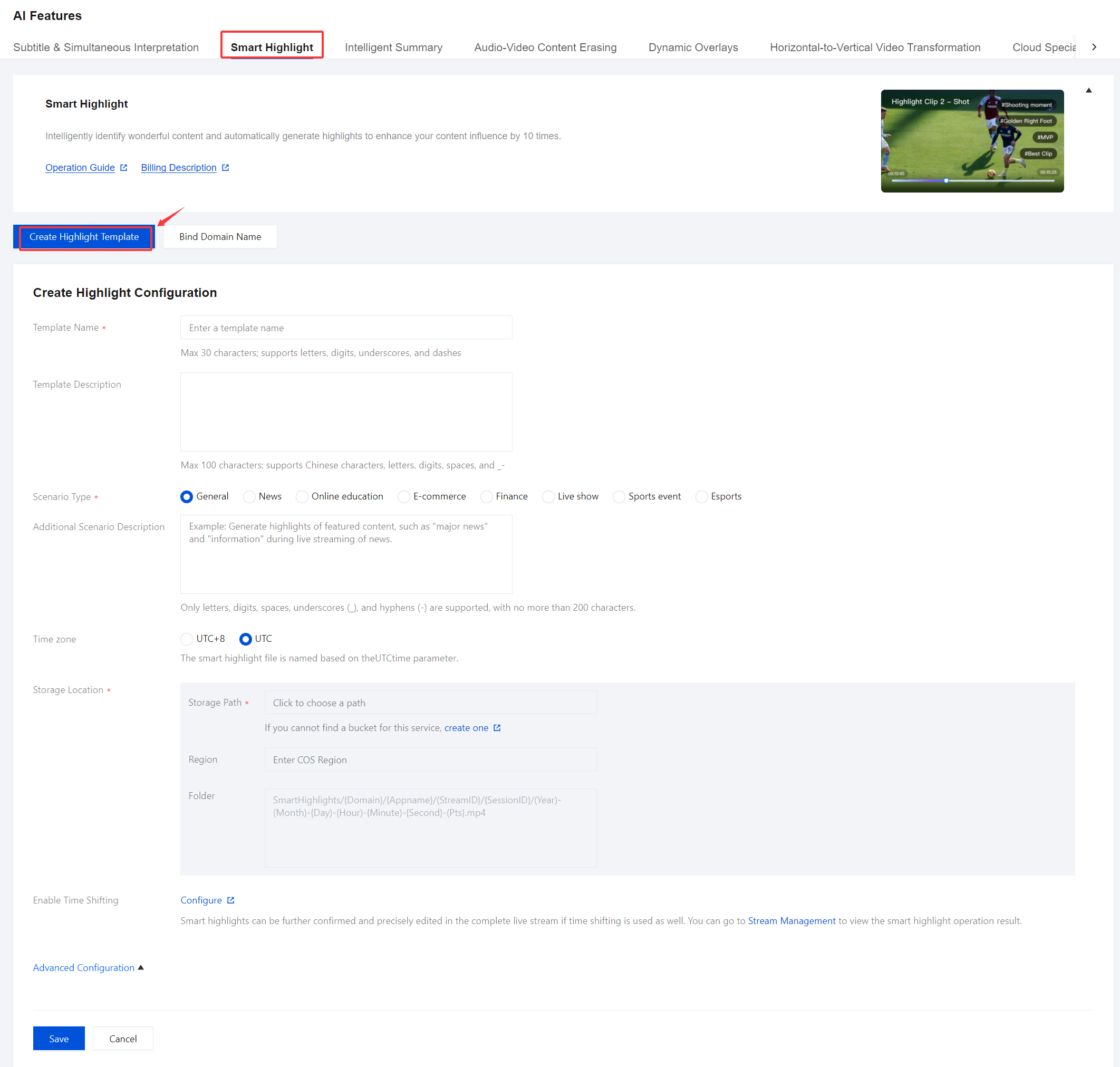 To use Smart Highlight in the AI ​​Features, you need to create a service role and authorize the current account role to use the Media Processing Service (MPS) and Cloud Object Storage (COS) products on first creation.