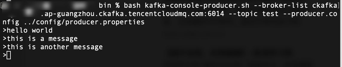 bash kafka-console-producer.sh --broker-list XXXX:port --topic XXXX --producer.config ../config/producer.properties