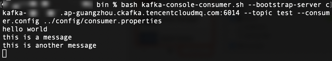 bash kafka-console-consumer.sh --bootstrap-server XXXX:port --topic XXXX --consumer.config ../config/consumer.properties