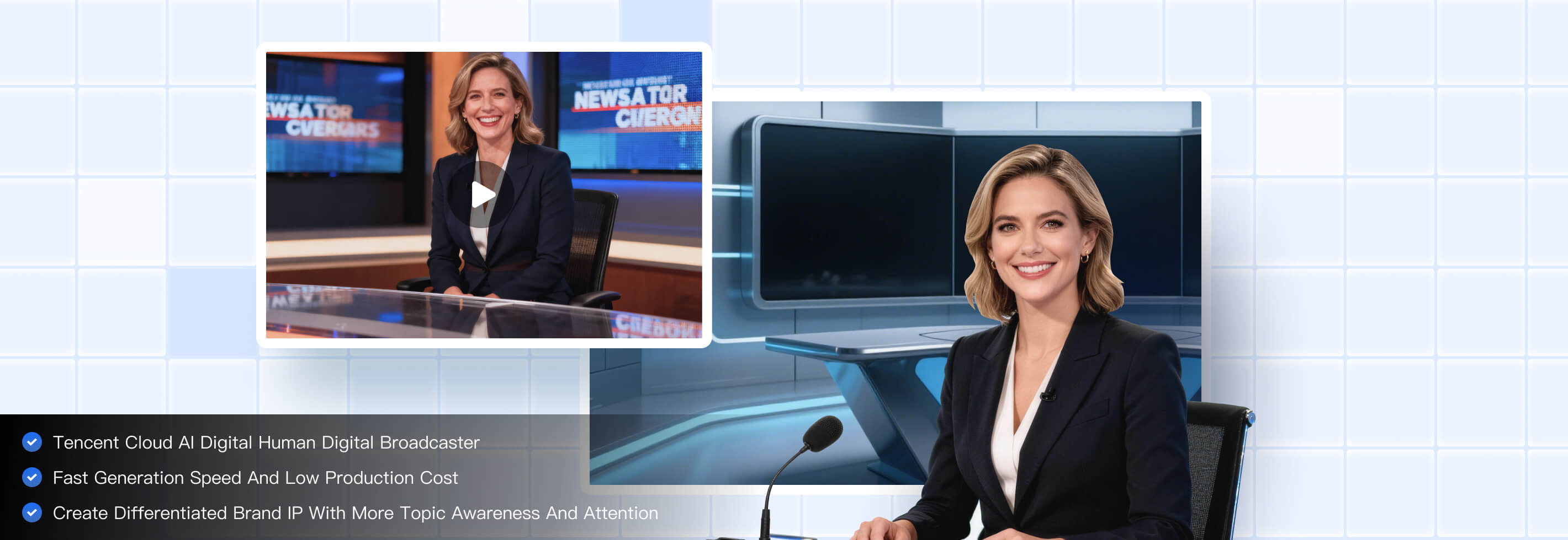 By using multiple AI technologies such as voice interaction and digital model generation, Tencent Cloud AI Digital Human has synchronized lip movements and pronunciation, and natural expressions and motions. It supports two types of usage scenarios: AI synthesis virtual image broadcast video and real-time voice interaction. The default virtual human image is used in virtual image broadcast, and the video file synthesized by AI can be generated by inputting text or audio on digital human platform. The lip movements of digital human are consistent with the pronunciation of the text, and the expressions and motions are natural. You can make real-time voice interaction with digital human in voice interaction scenarios.