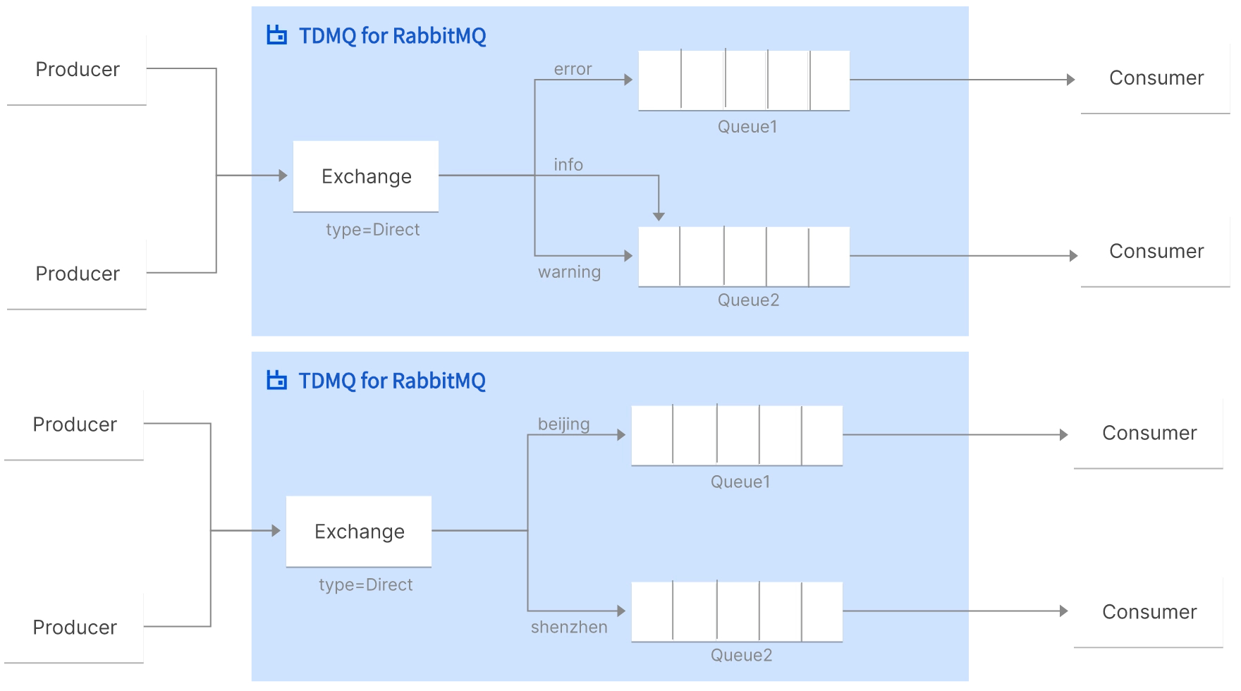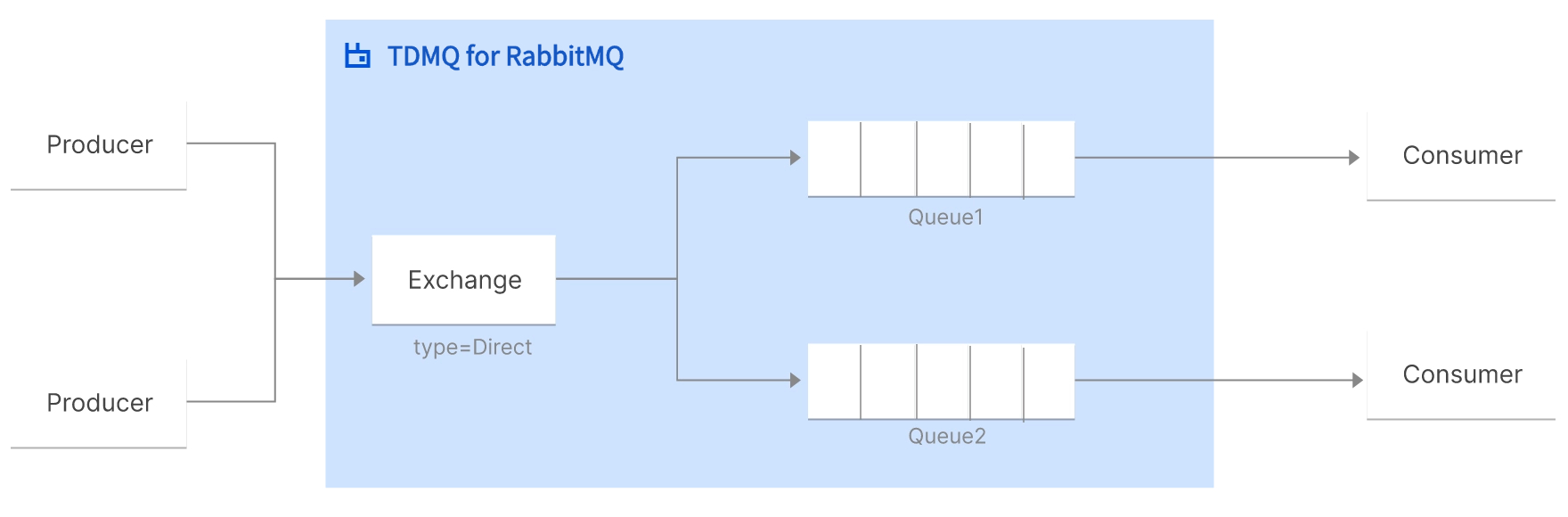 With the popularity of Microservices Architecture, services are split into smaller parts, and data is sent in the form of messages to different queues using carefully designed distribution strategies. TDMQ for RabbitMQ's flexible message routing capabilities can fully distribute messages to target queues. Use cases include: