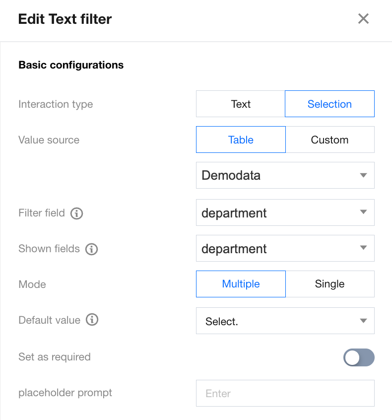 Set the interaction type of the "department" filter to "selection input".