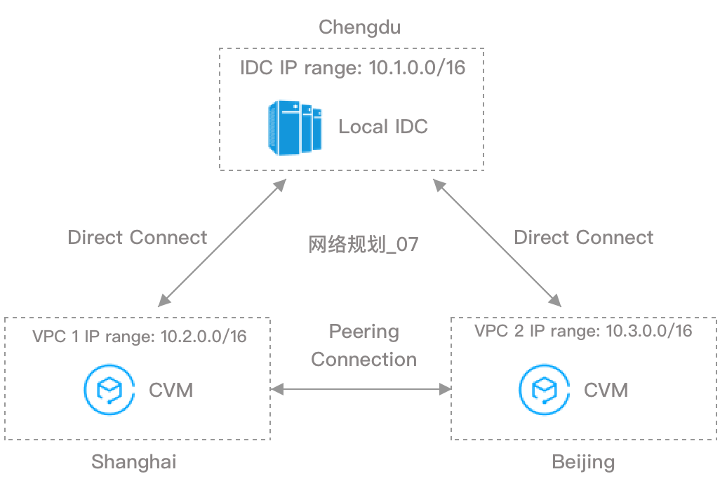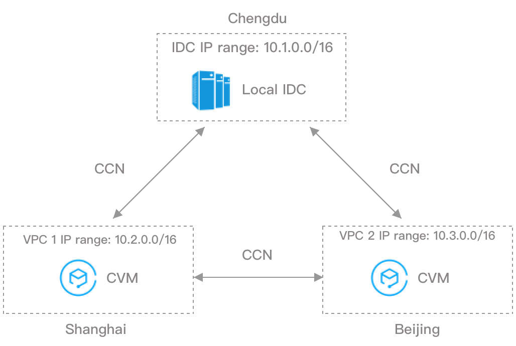 Suponha que você tenha um IDC local com intervalo de IP 10.1.0.0/16 em Chengdu e deseja criar dois IDCs em nuvem em Xangai e Pequim, que precisam se comunicar com seu IDC local. Nesse caso, recomendamos que você use 10.2.0.0/16 e 10.3.0.0/16 como os intervalos de IP do VPC dos dois IDCs de nuvem em Xangai e Pequim, respectivamente, para evitar falha de comunicação causada por intervalos de IP sobrepostos. Você pode habilitar a comunicação entre IDC local e IDCs de nuvem e entre os IDCs de nuvem usando os dois métodos abaixo.