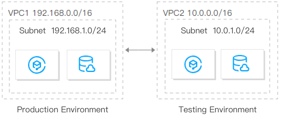 Por padrão, os VPCs não são interconectados. Para interconectar os VPCs, use o Peering Connection ou o Cloud Connect Network. Vários negócios estão implantados na mesma região e exigem isolamento