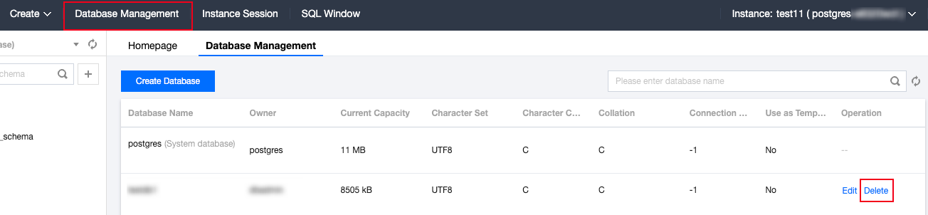 The current console does not support direct deletion of databases. If necessary, please click Delete in the Operation column. The system will automatically redirect you to the DMC management interface. Navigate to Database Management, then click Delete in the Operation column to complete the deletion process.