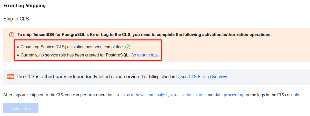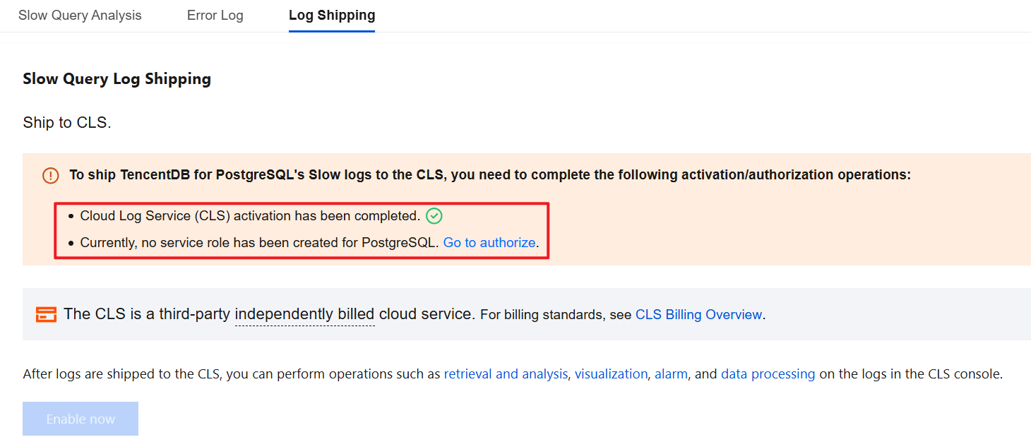 3. Enabling the Log Shipping feature for the first time requires activating the CLS log service, creating a service role for PostgreSQL, and granting authorization. If this has been completed, you may skip this step.