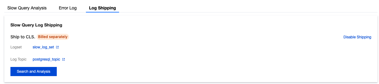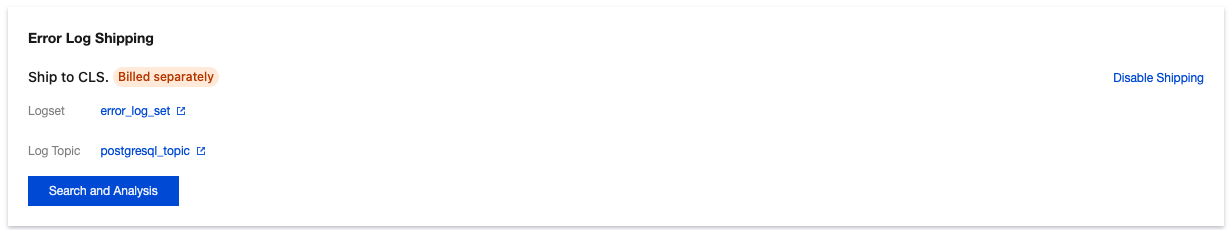 You can manage log topics. For details, see Log Topic. 6. After error log shipping is successfully enabled, you can see that error log shipping is enabled under Log Shipping. Click the log topic name to jump to the CLS console for subsequent analysis and management. Disabling Error Log Shipping