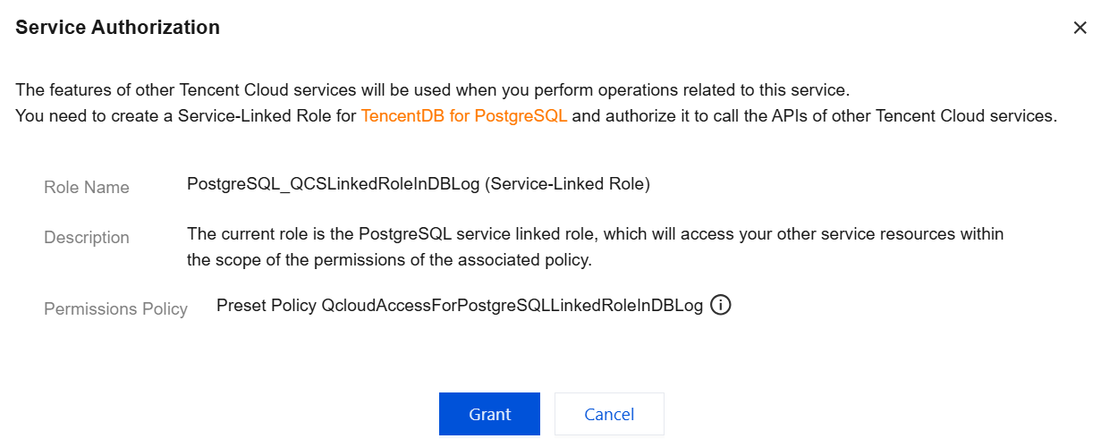 3. The first time you enable the Log Shipping feature, you need to activate the CLS service, create a service role for PostgreSQL, and complete the authorization. The specific operations are as follows. If this has been done, ignore it.