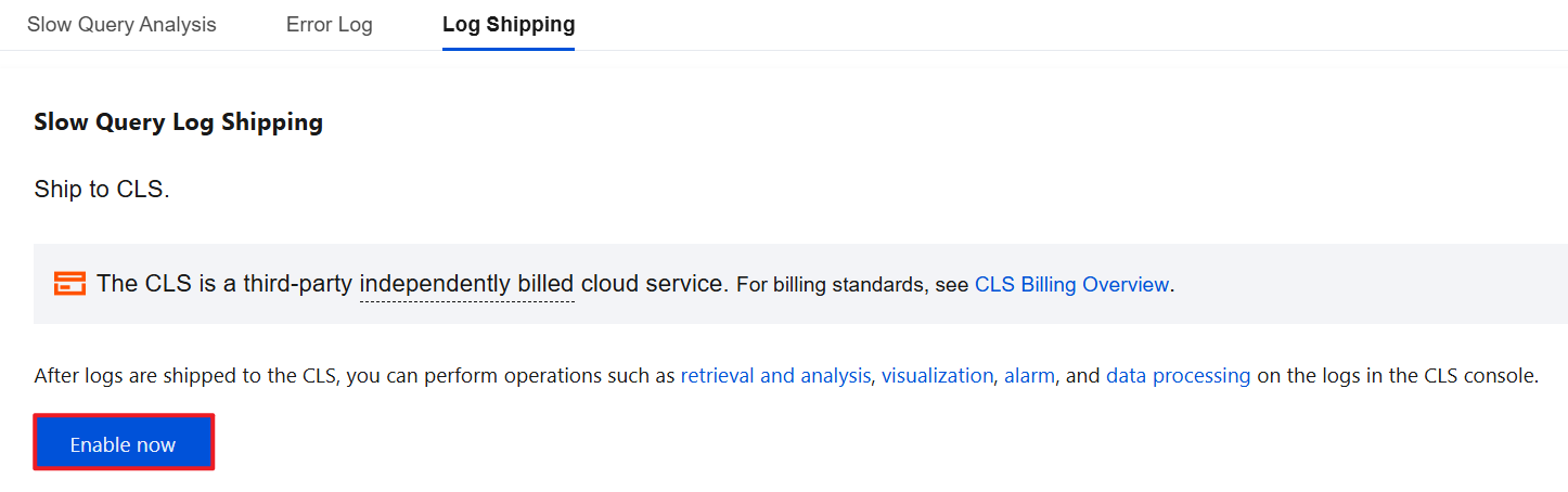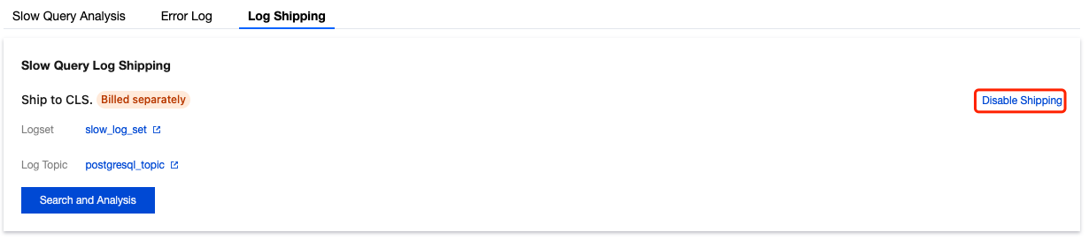 You can manage log topics. For details, see Log Topic. 6. After slow log shipping is successfully enabled, you can see that slow log shipping is enabled under Log Shipping. Click the log topic name to jump to the CLS console for subsequent analysis and management. Disabling Slow Log Shipping