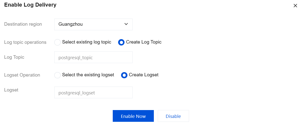 Select existing log topic | If the log topic is set to Select existing log topic, you need to further select the existing logset and log topic. Logset: Logset classify log topic to facilitate log topic management. You can filter existing logset in the search box. Log Topic: A log topic is the basic unit for collecting, storing, retrieving, and analyzing log data. You can filter log topics of the selected logset in the search box. |