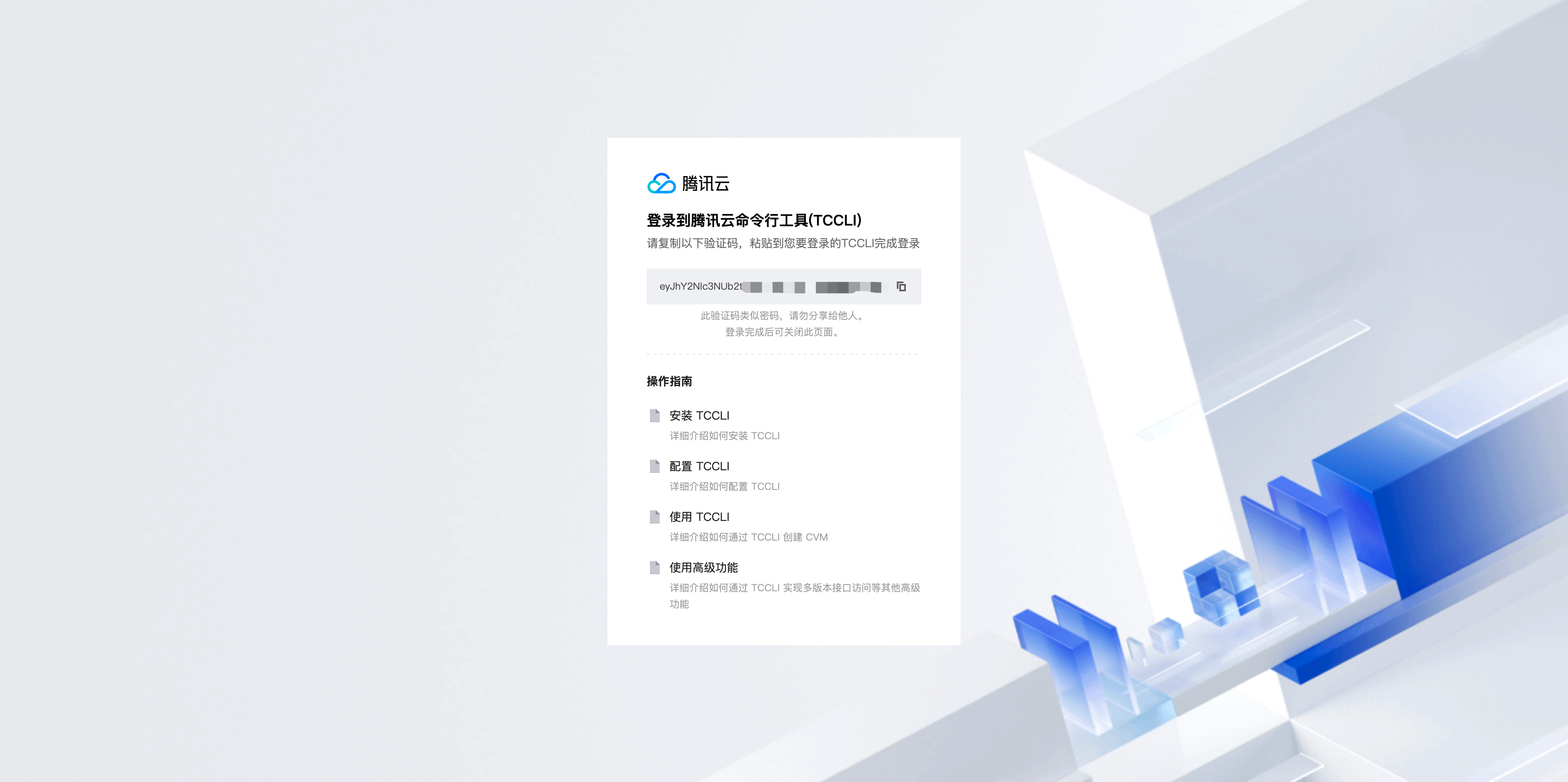 在浏览器中转到以下链接, 并根据提示完成登录:https://www.tencentcloud.com/zh/account/open/authorize?scope=******完成后,输入浏览器中提供的验证码: