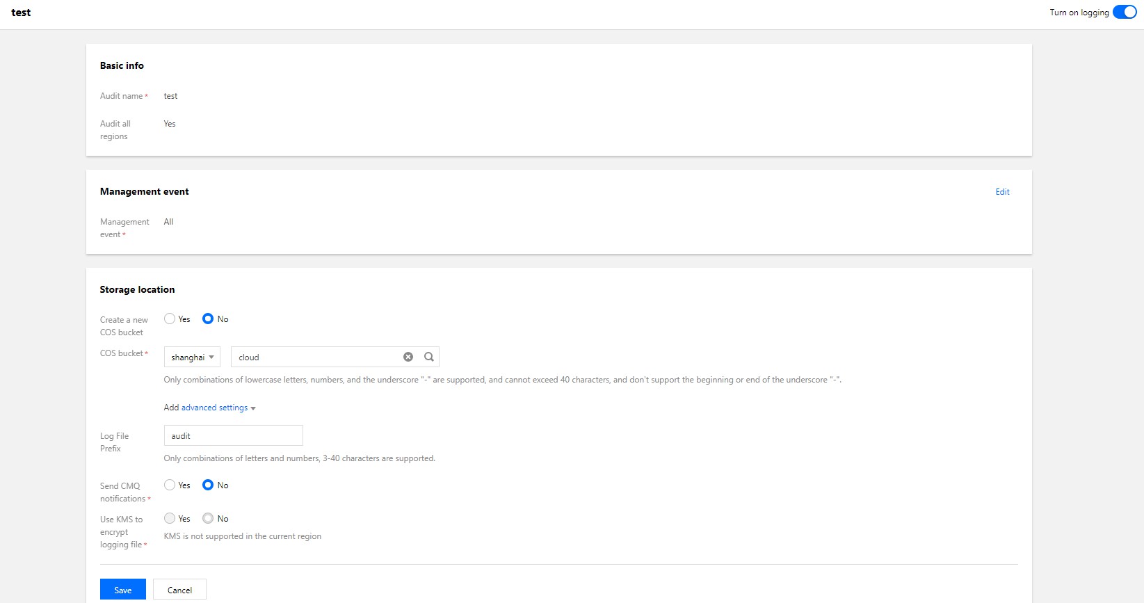 单击跟踪集详情页面“投递位置”中的编辑,可以选择投递存储桶(COS)或者投递到日志服务(CLS),编辑完成后单击保存即可。如下图所示: