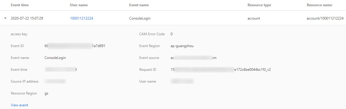 您在获取到相关的操作记录列表后,如果想更进一步了解单个操作记录,可以单击该操作记录左侧的 ,您就会得到此操作记录的详情,包括事件时间、用户名、事件名称、访问密钥、事件 ID、源 IP 地址、资源区域、CAM 错误码、事件区域、 事件源、请求 ID。同时,可以单击查看事件,进行了解事件的相关信息。如下图所示: