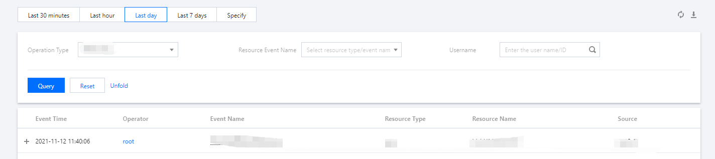3. 在操作记录页面中,您可以根据用户名称、操作类型、资源事件名称、资源名称、请求 ID 、API 错误码、密钥 IP 及对应操作事件时间,获取相关的操作记录信息,您需要查询的操作记录将会以列表的形式展示出来,默认情况下只展示部分数据。如下图所示: