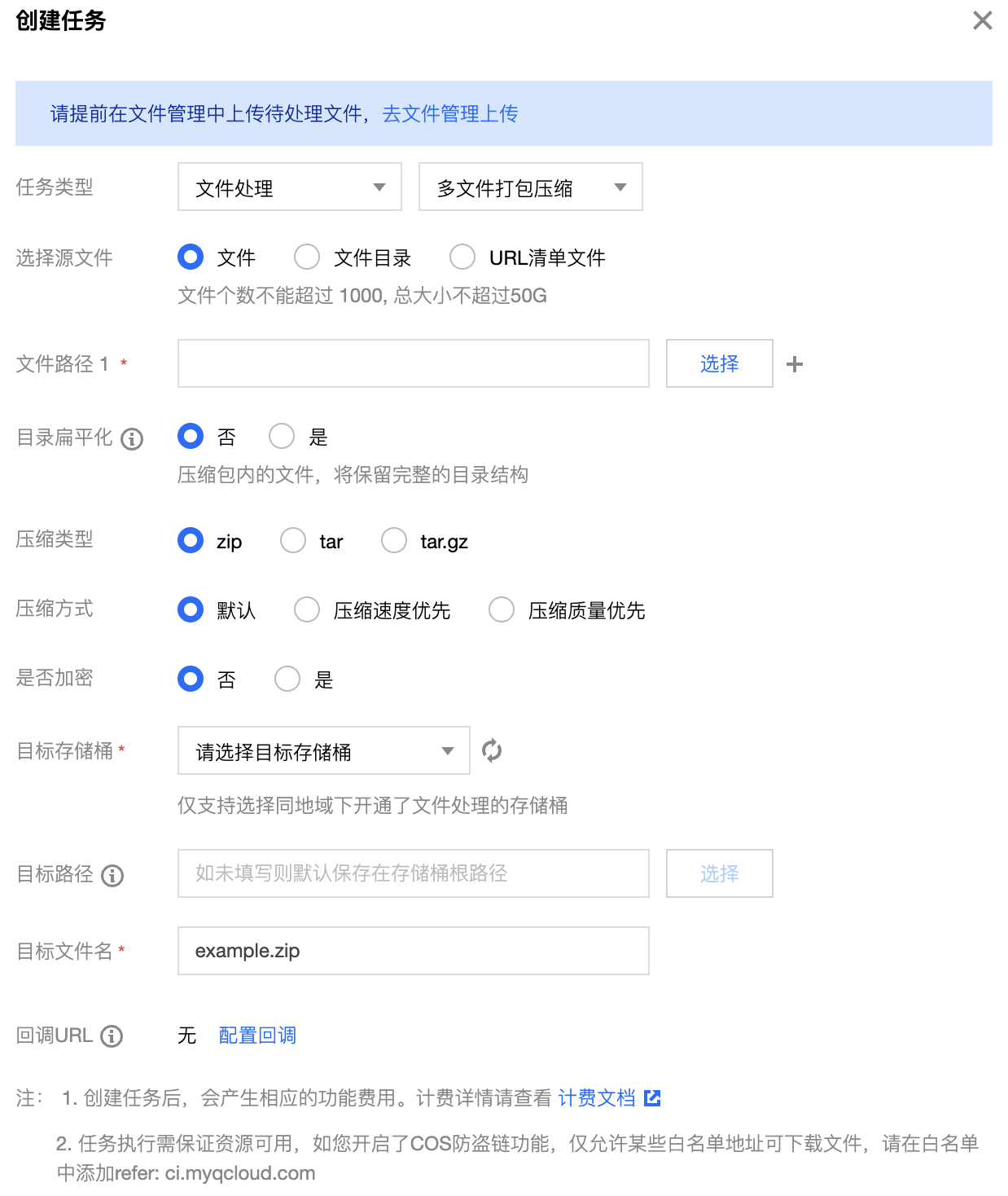 回调 URL:与队列绑定的回调地址信息,详情请参见 队列与回调。 多文件打包压缩