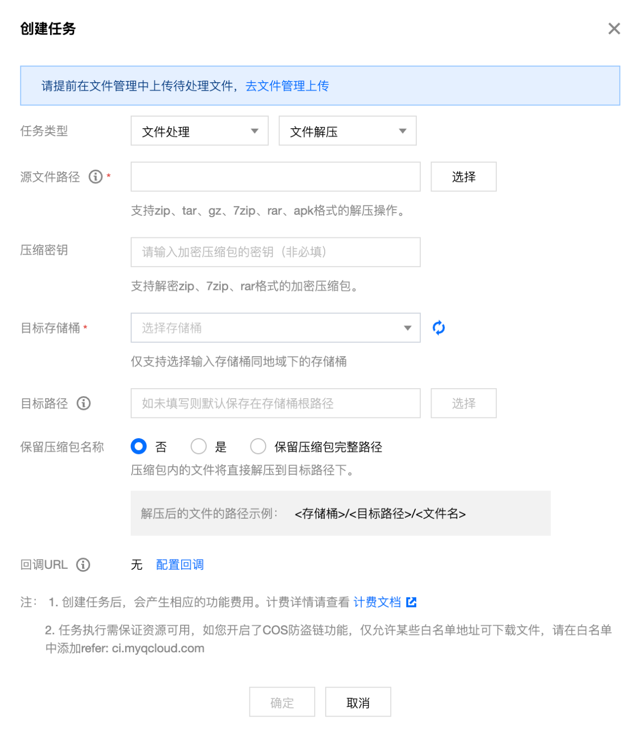 目标路径:文件解压后保存的具体路径,如不填写则默认保存在目标存储桶根路径。