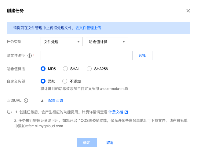 5. 任务类型选择哈希值计算,单击创建任务,按照如下配置项说明配置后,单击确定。