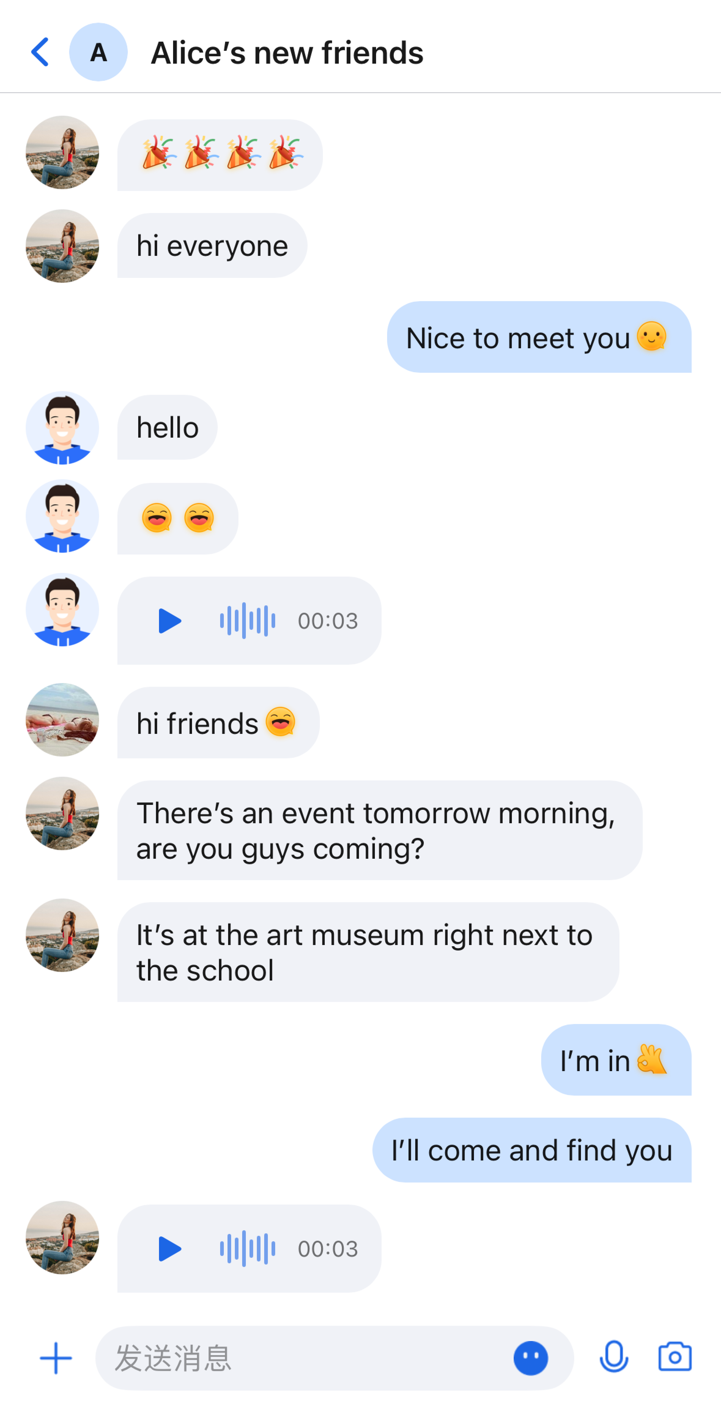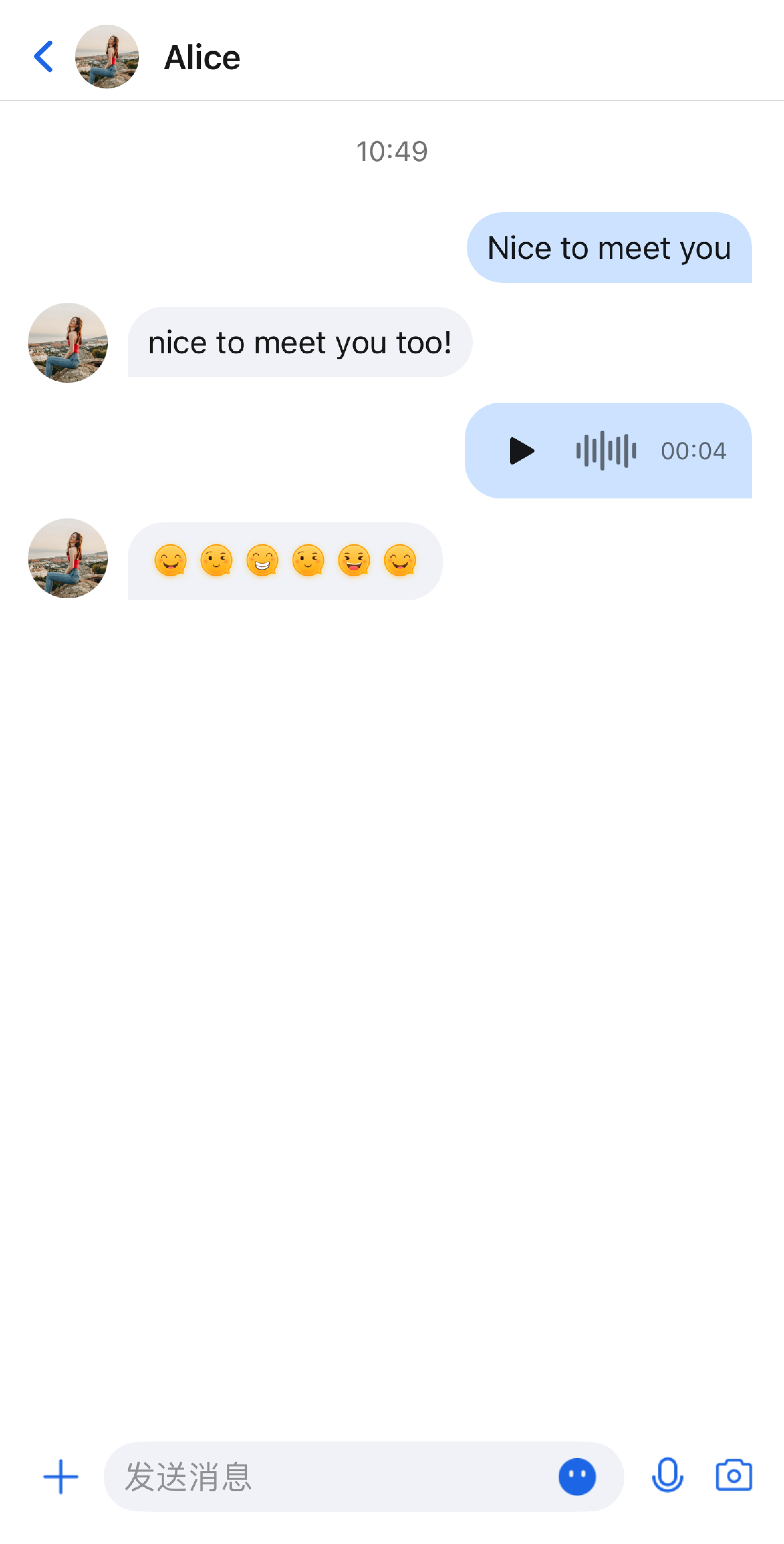 #import "TUIBaseChatViewController.h"#import "TUIC2CChatViewController.h"#import "TUIGroupChatViewController.h"// ChatViewController is your own ViewController@implementation ChatViewController- (void)viewDidLoad {// Create conversation data.TUIChatConversationModel *conversationData = [[TUIChatConversationModel alloc] init];// Pass userID for 1v1 chat, while groupID for group chat.conversationData.userID = @"userID";conversationData.groupID = @"groupID";// Create chatVC by groupID or userID.TUIBaseChatViewController *chatVC = nil;if (conversationData.groupID.length > 0) {chatVC = [[TUIGroupChatViewController alloc] init];} else if (conversationData.userID.length > 0) {chatVC = [[TUIC2CChatViewController alloc] init];}[chatVC setConversationData:conversationData];// Option 1: push chatVC.[self.navigationController pushViewController:chatVC animated:YES];// Option 2: add chatVC to your own ViewController.// [self addChildViewController:chatVC];// [self.view addSubview:chatVC.view];}@end