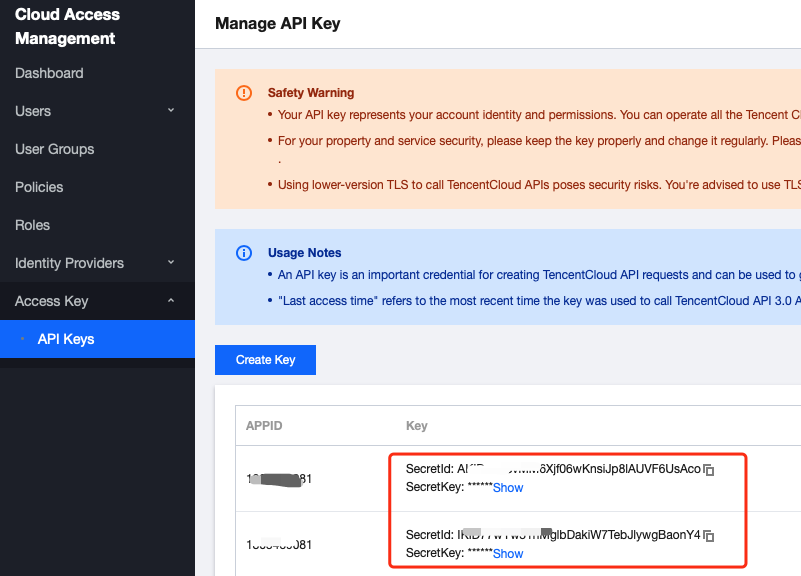 SecretId、SecretKey | ![]() |