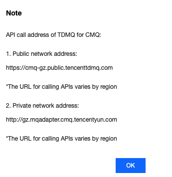 # api认证信息cred = credential.Credential(SecretId, SecretKey)httpProfile = HttpProfile()httpProfile.endpoint = NameServerAddressclientProfile = ClientProfile()clientProfile.httpProfile = httpProfileclient = tdmq_client.TdmqClient(cred, "ap-guangzhou", clientProfile)req = models.CreateCmqTopicRequest()params = {"TopicName": "topic_api", # 主题名字,在单个地域同一账号下唯一"FilterType": 1, # 用于指定主题的消息匹配策略。1:表示标签匹配策略;2:表示路由匹配策略"MsgRetentionSeconds": 86400 # 消息保存时间。取值范围60 - 86400 s(即1分钟 - 1天)}req.from_json_string(json.dumps(params))# 创建topicresp = client.CreateCmqTopic(req)