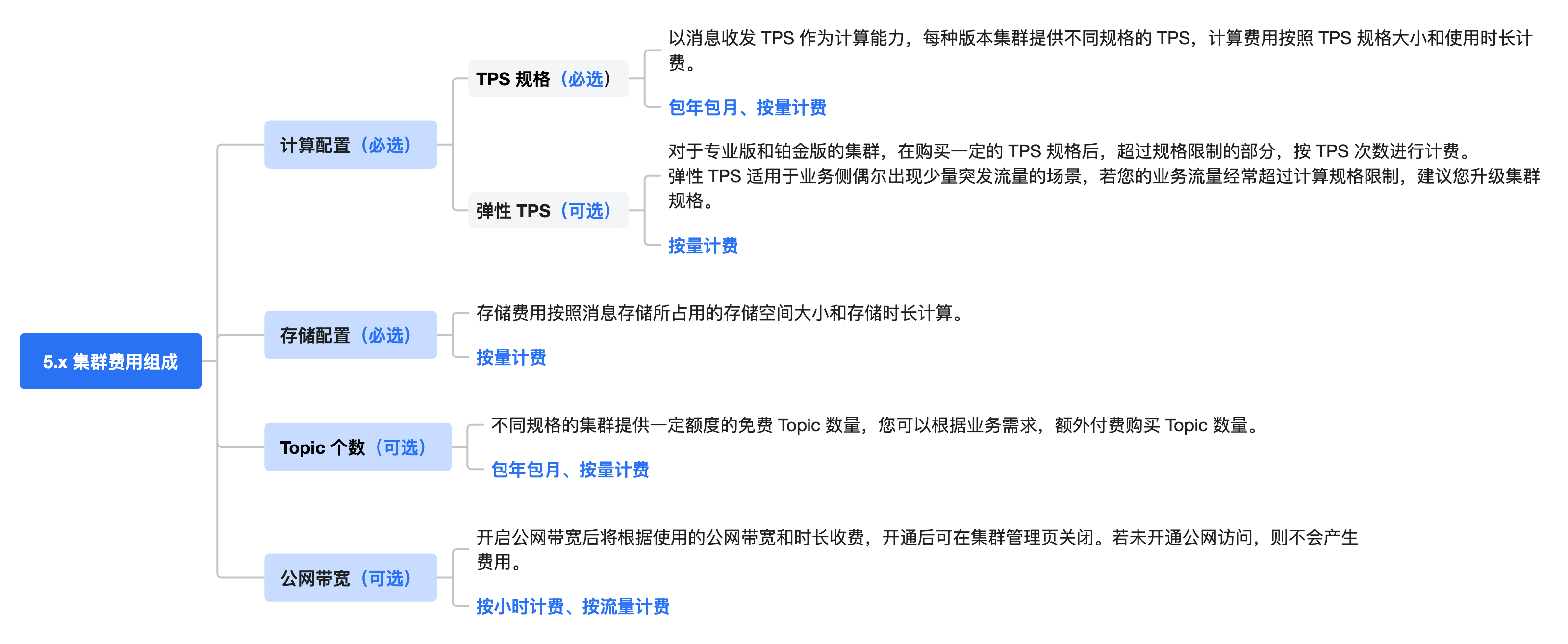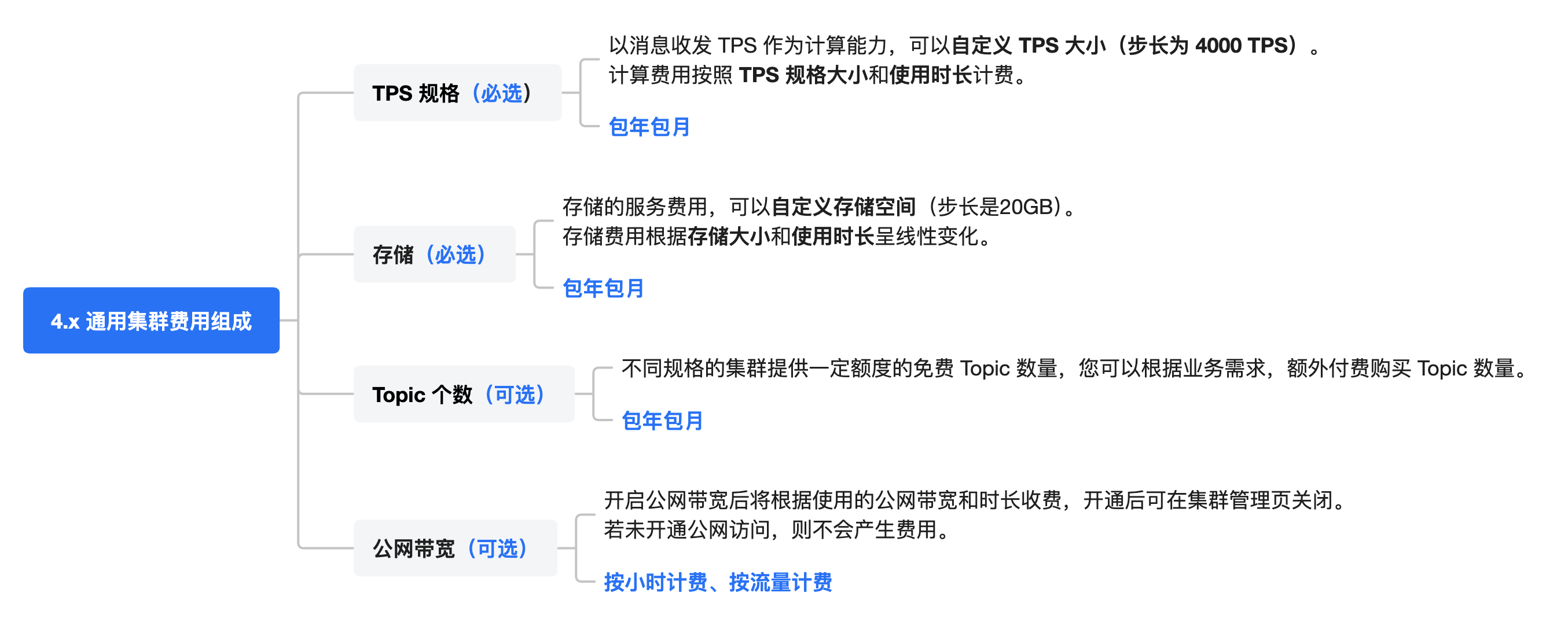 集群整体价格 = 计算配置费用 + 存储配置费用 + 额外购买 Topic 费用 + 公网带宽费用 = TPS 规格 × TPS 单价 + 弹性 TPS 大小 × 弹性 TPS 单价 + 存储规格 × 存储单价 + 额外购买 Topic 数量 × Topic 单价 + 公网带宽大小 × 公网带宽单价。
