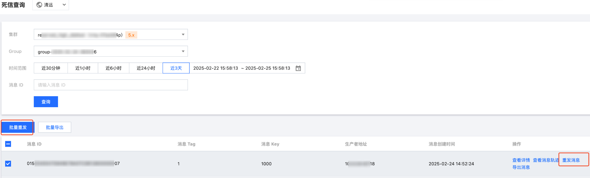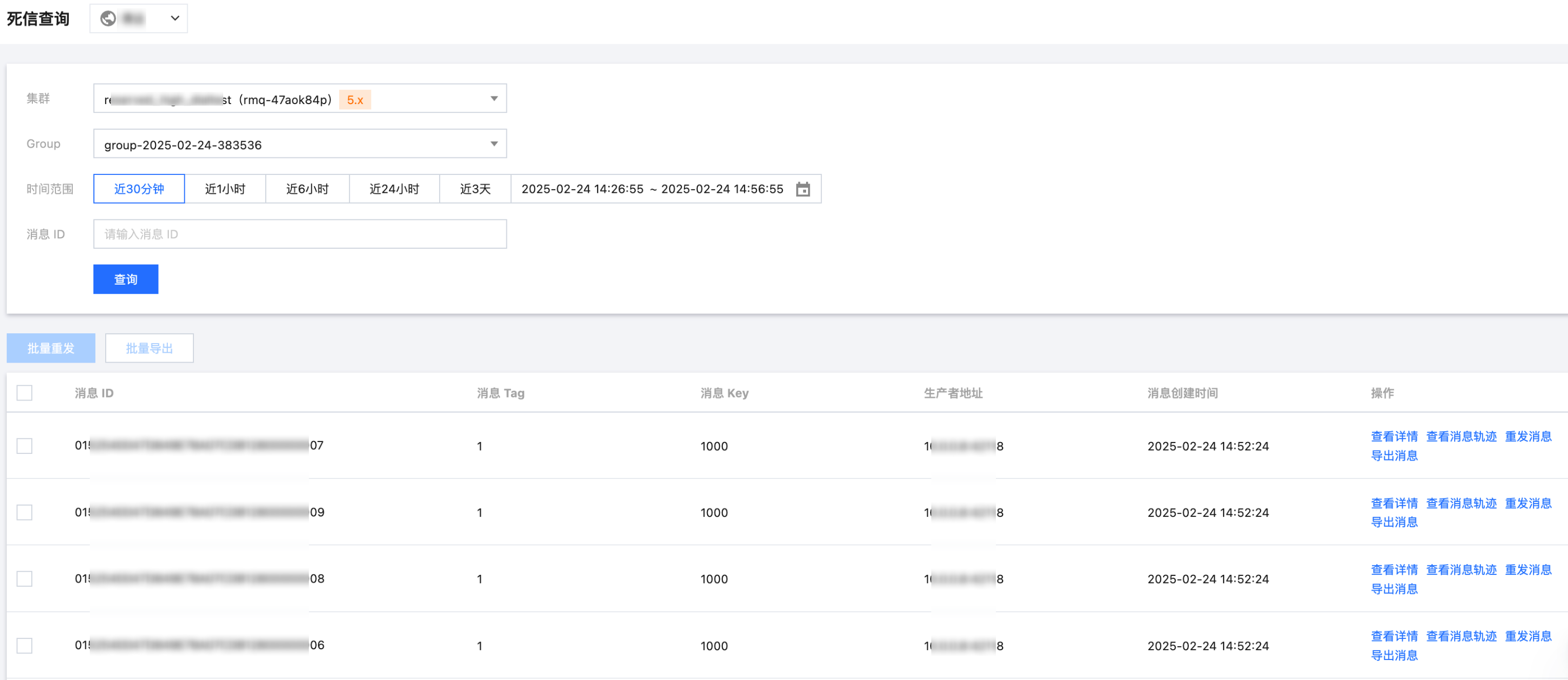 不填写消息 ID:属于模糊查询。根据 Group ID 和死信消息产生的时间范围,批量查询该 Group ID在某段时间内产生的所有死信消息。
