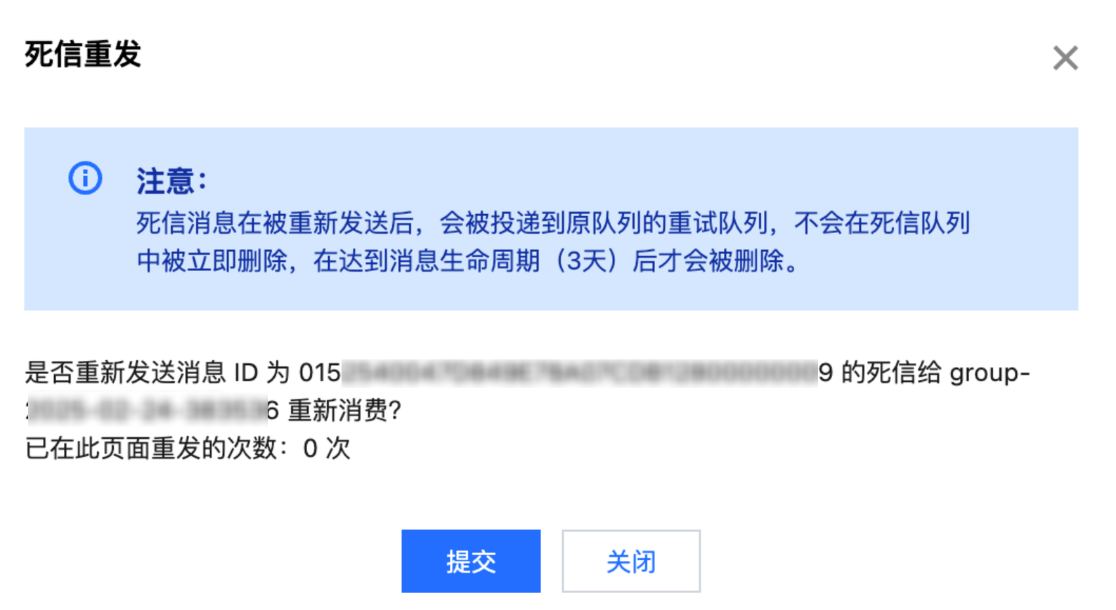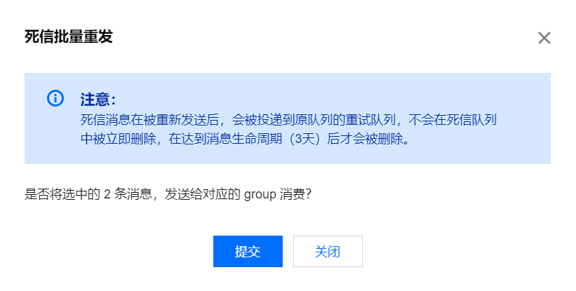 您可以勾选多条死信消息后单击左上角的批量重发消息将死信消息批量重新发送到原队列的重试队列,也可以单击某条消息操作列的重发消息将单条死信消息重新发送。死信消息在被重新发送后,服务端会将这些消息投递到原队列的重试队列,可以被正常消费,且不会在死信队列中被立即删除,在达到消息生命周期(3天)后才会被删除。