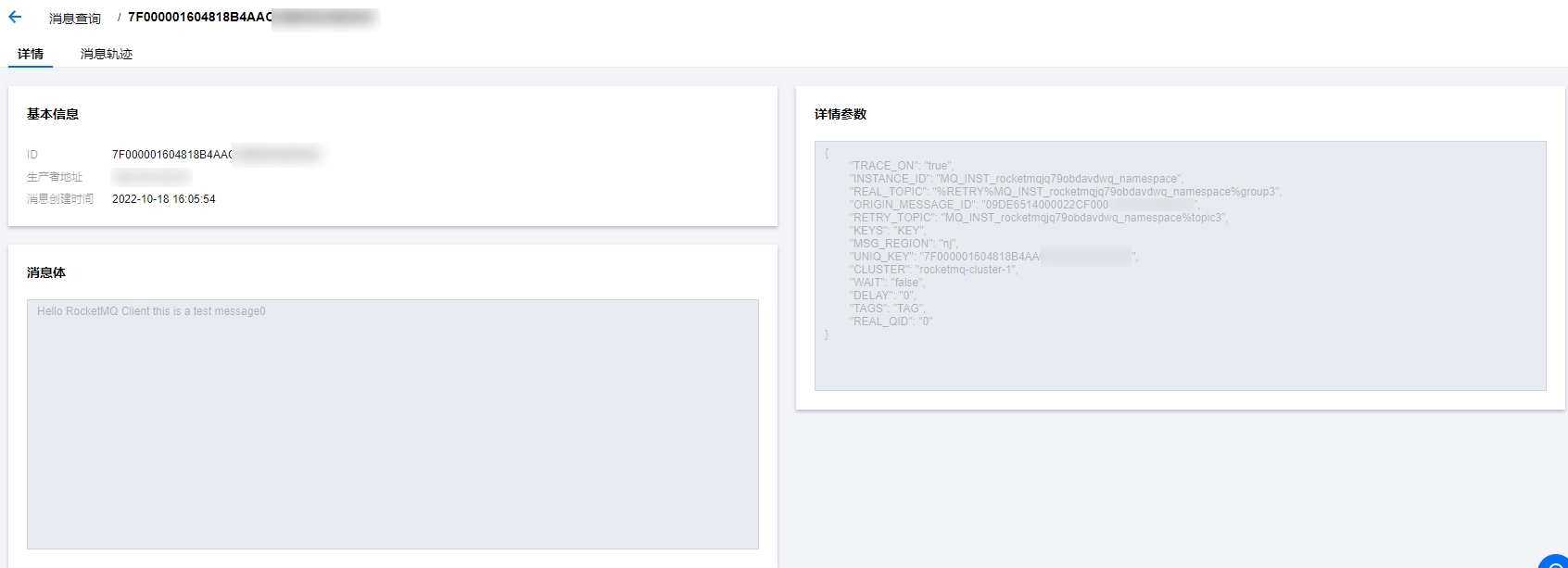 5. 找到您希望查看内容或参数的消息,单击操作列的查看详情,即可查看消息的基本信息、内容(消息体)以及参数。