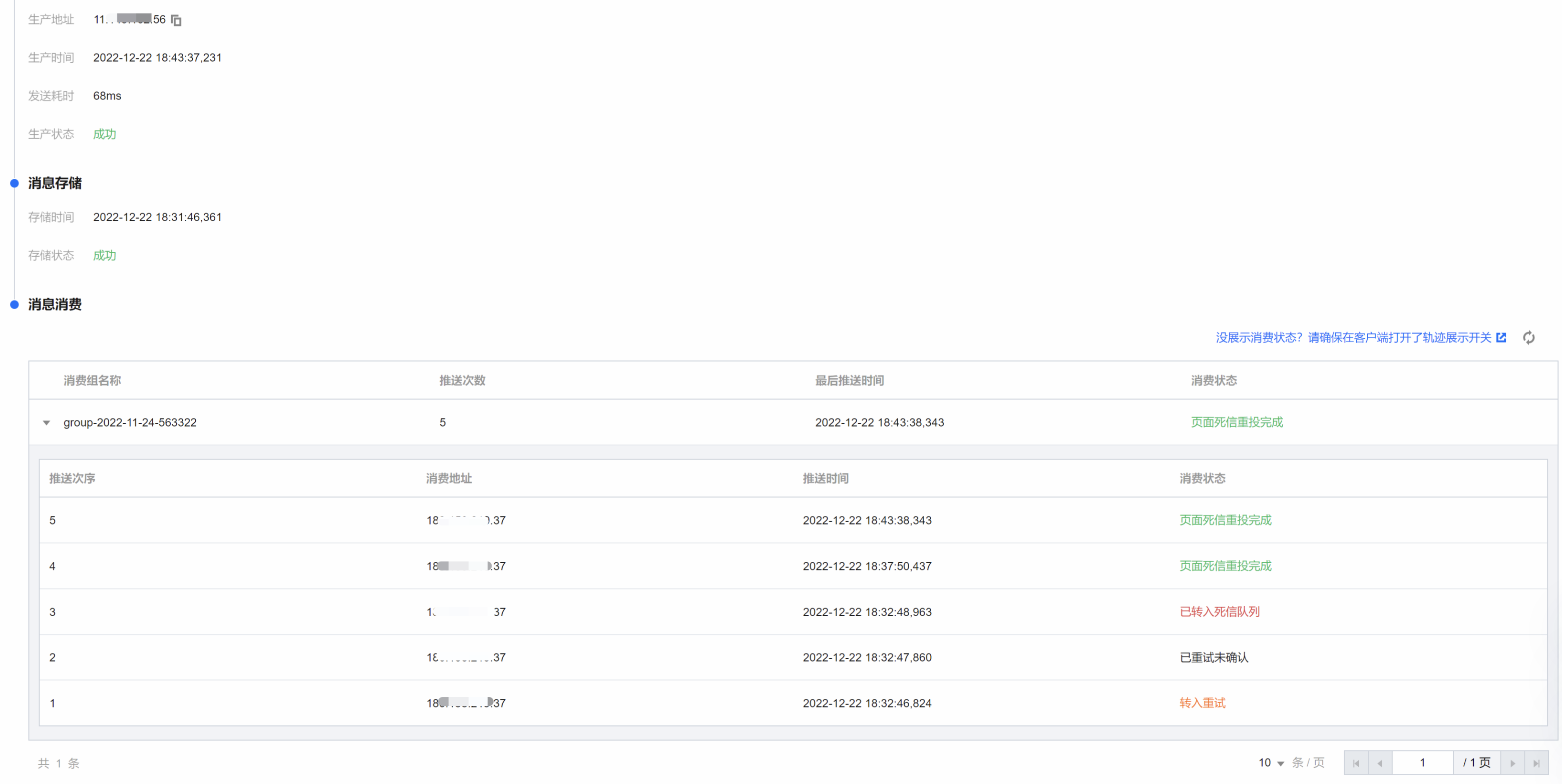 6. 单击操作列的查看消息轨迹,或者在详情页单击 Tab 栏的消息轨迹,即可查看该消息的消息轨迹(详细说明请参见 消息轨迹查询结果说明)。