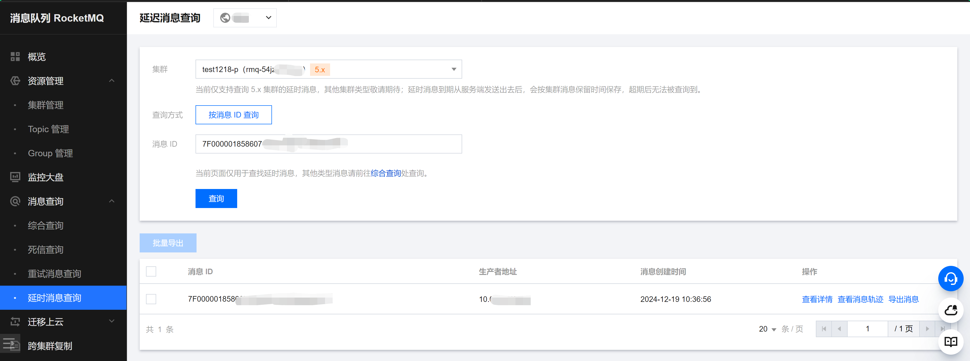 4. 完成查询后,可以查看消息的创建和生产时间,和其他的消息查询结果类似,可以对消息进行查看轨迹和导出等操作。