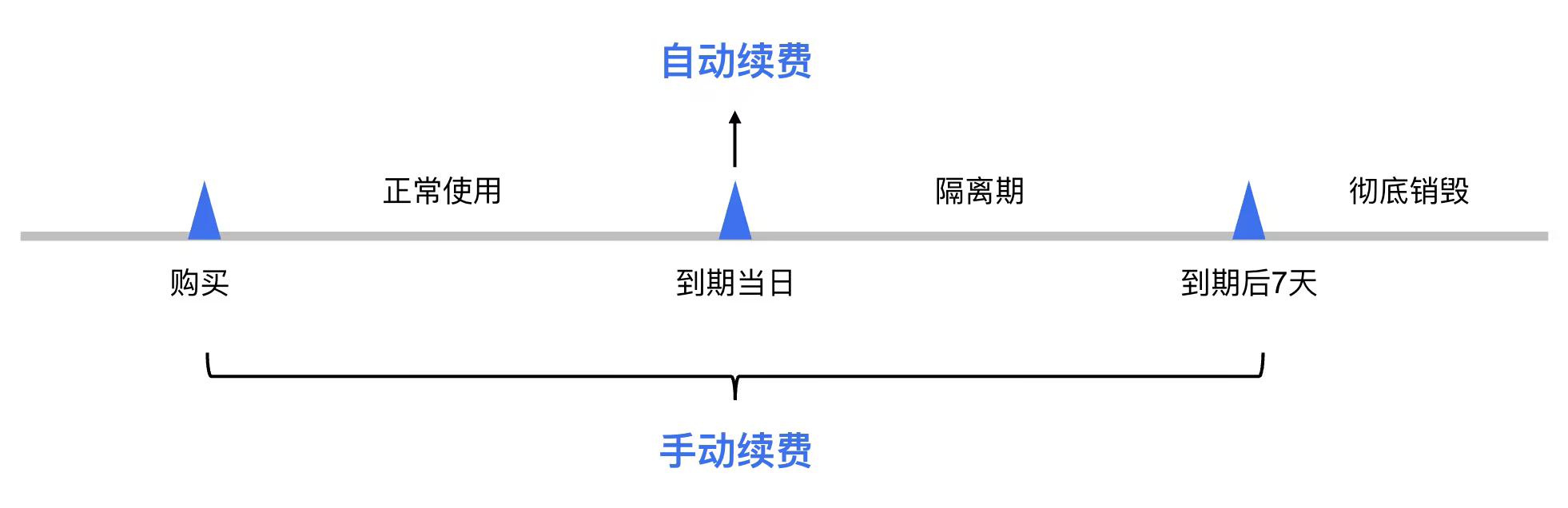 手动续费:包年包月集群自购买到被彻底销毁期间,您可以在任意时间为集群手动续费,以延长集群的使用时间。