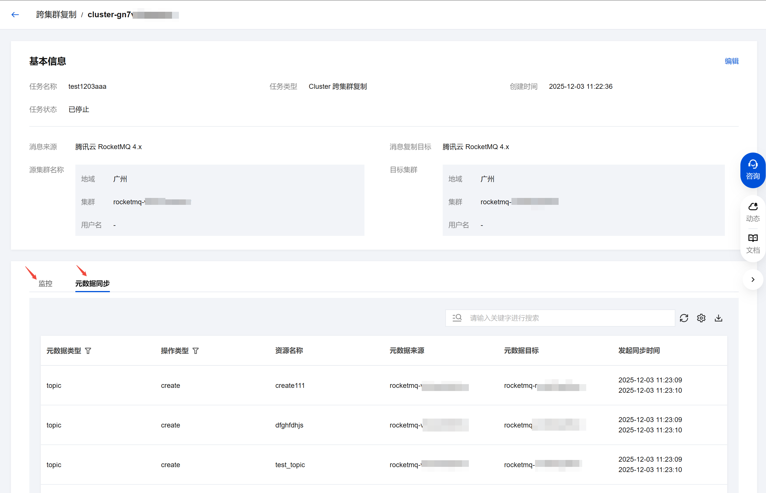 删除:删除当前任务,删除后复制任务将暂停,任务的相关配置也将被删除,请谨慎操作。删除任务后,在源集群进行的元数据(Topic、Group 和角色等)修改将不再复制到目标集群