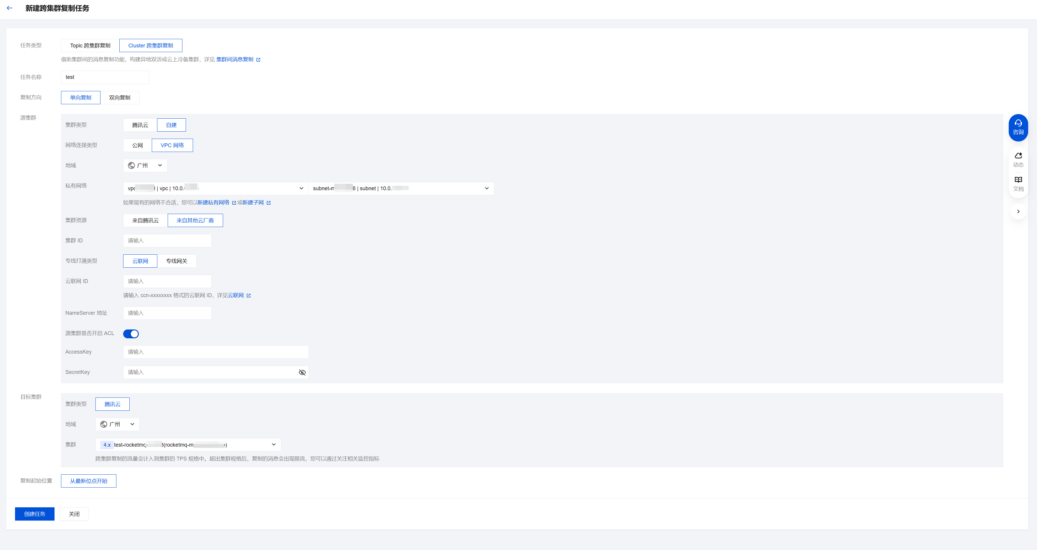 私有网络:选择预先创建的 VPC 网络和子网,如果没有合适的VPC网络,可以前往私有网络控制台新建。 资源类型:TDMQ RocketMQ 支持来自腾讯云和其他云厂商的自建 RocketMQ 实例间进行消息复制,此时根据实际的 RocketMQ 实例的位置进行选择。如要和位于腾讯云上的自建集群进行消息互通,则选择 来自腾讯云,后续步骤只需要填写 集群ID、Name Server 地址和 ACL 配置即可,腾讯云 TDMQ RocketMQ 会自动打通腾讯云上的 VPC 网络。如果选择了 来自其他云厂商,除了集群ID、Name Server 地址和 ACL 配置外,还需要选择专线打通类型和对应的资源ID 来进行网络的打通。