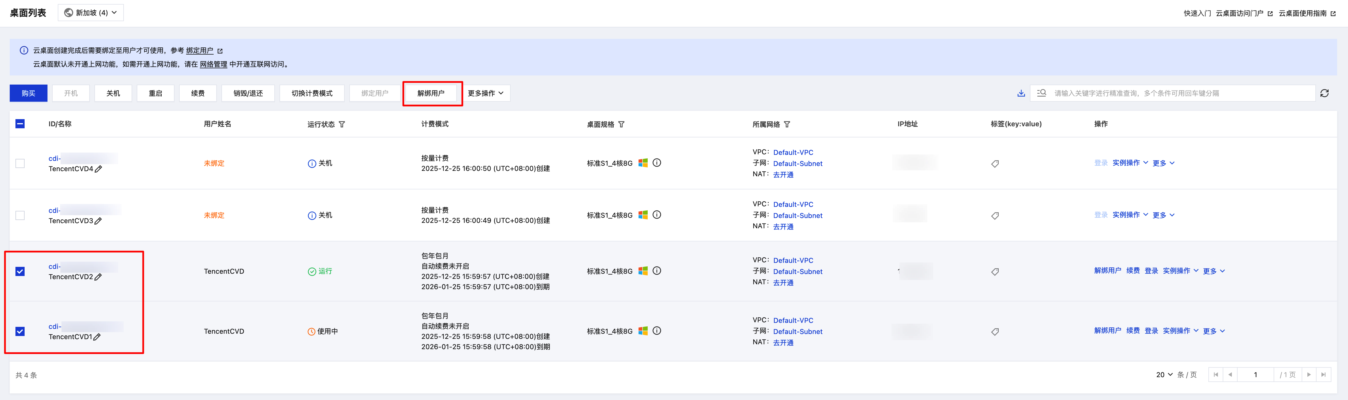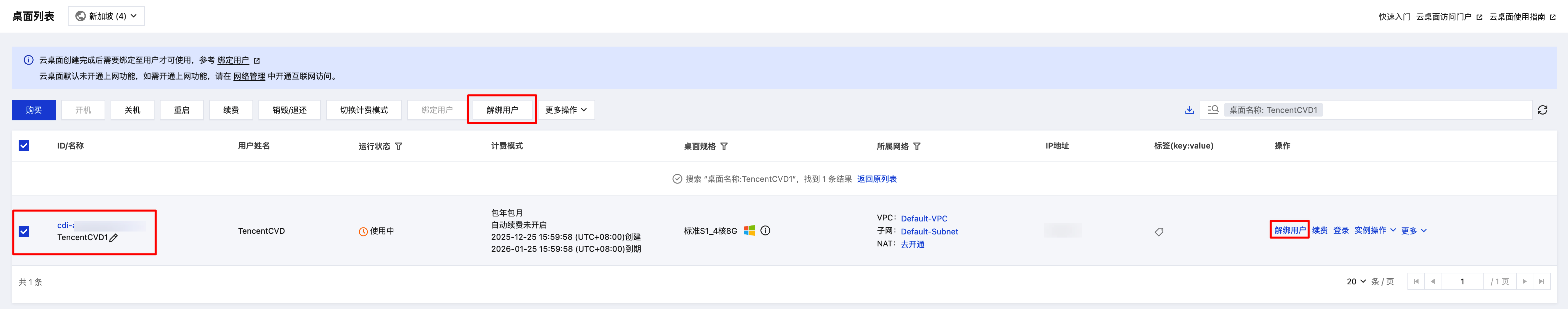 2. 在桌面列表中,选择您需要操作的云桌面,在上方操作栏或右侧操作列中单击解绑用户。