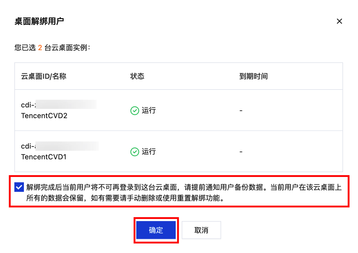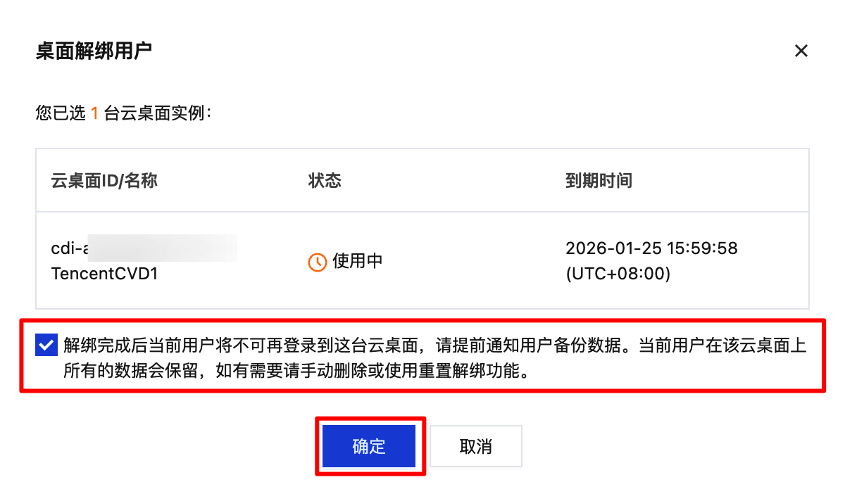 如当前云桌面运行状态为使用中,解绑用户操作后当前用户正在连接的云桌面会话将被注销,请提前通知用户备份数据。