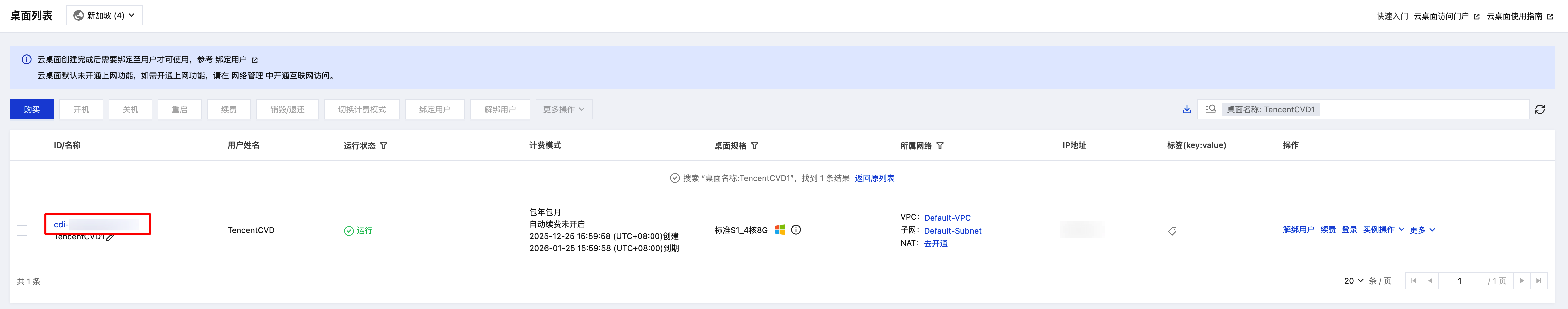 2. 在桌面列表中,选择需要回滚的云桌面,单击左侧的云桌面 ID 进入云桌面详情页。