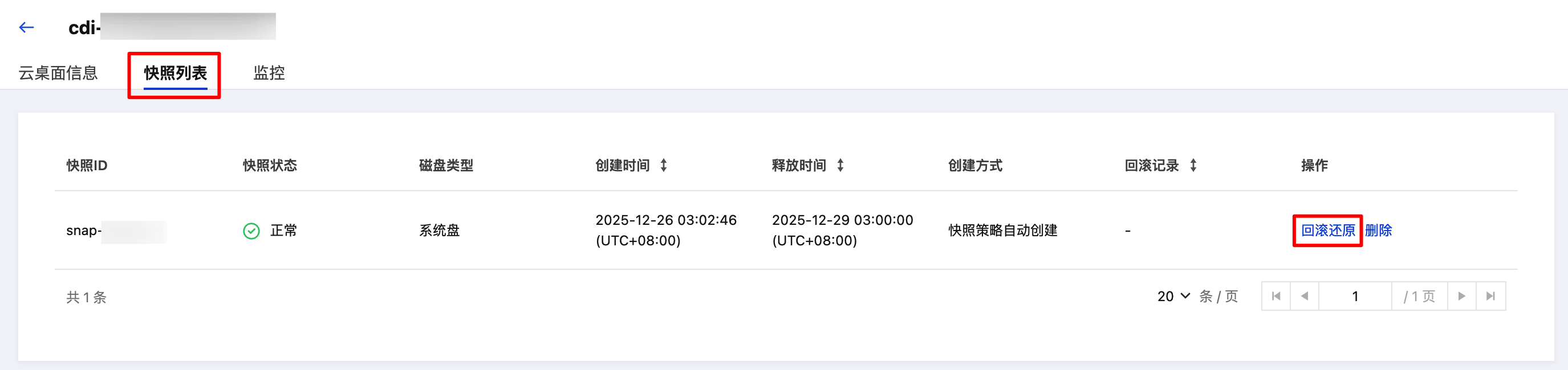 3. 在云桌面详情页中,单击进入快照列表页面。选择需要回滚的快照项,并在右侧操作列中单击回滚还原。
