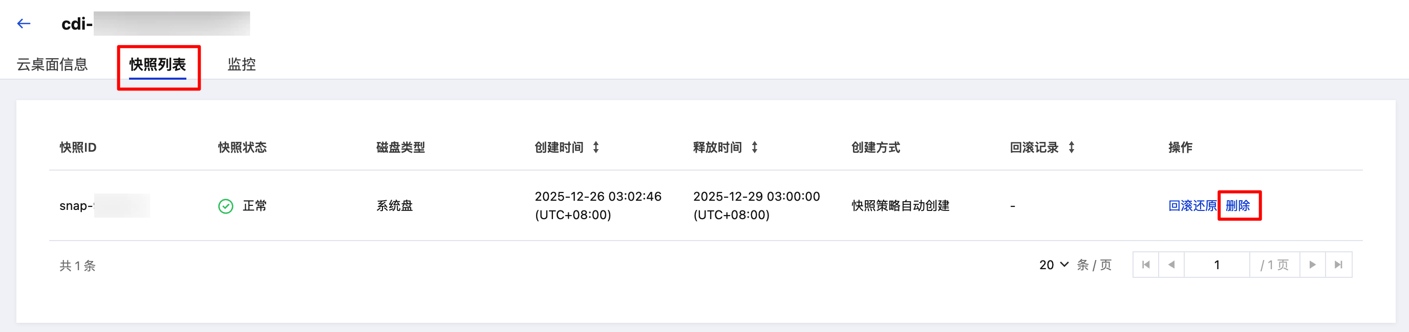 3. 在云桌面详情页中,单击进入快照列表页面。选择需要删除的快照项,并在右侧操作列中单击删除。