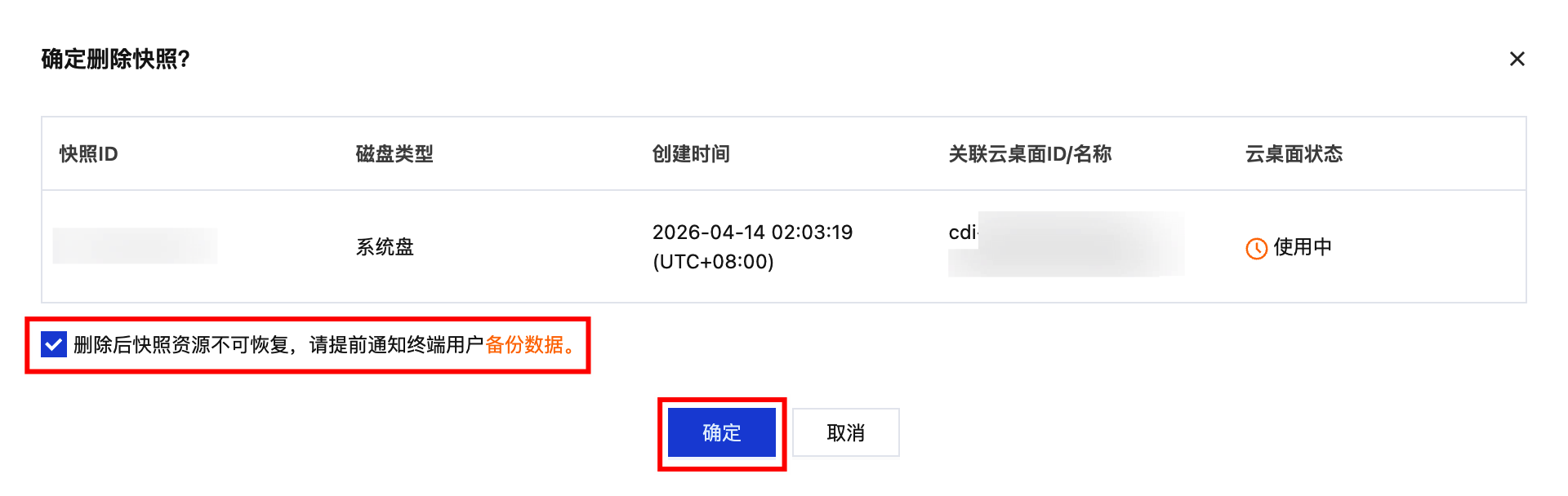 4. 删除的快照无法恢复,如果确认需要删除,请先勾选“删除快照后资源不可恢复,请提前通知终端用户备份数据”的提示框,再单击下方的确定。
