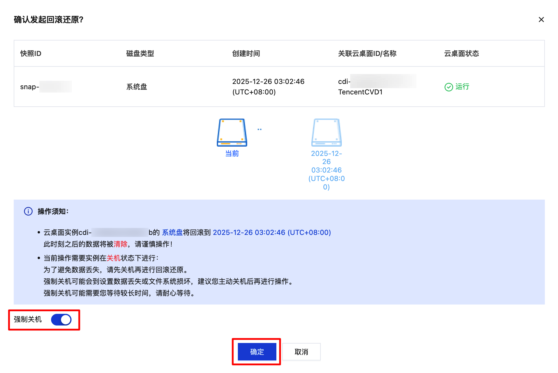 4. 进行回滚二次确认,回滚会清除当前云桌面数据,阅读风险提示后勾选强制关机开关,单击下方的确定。