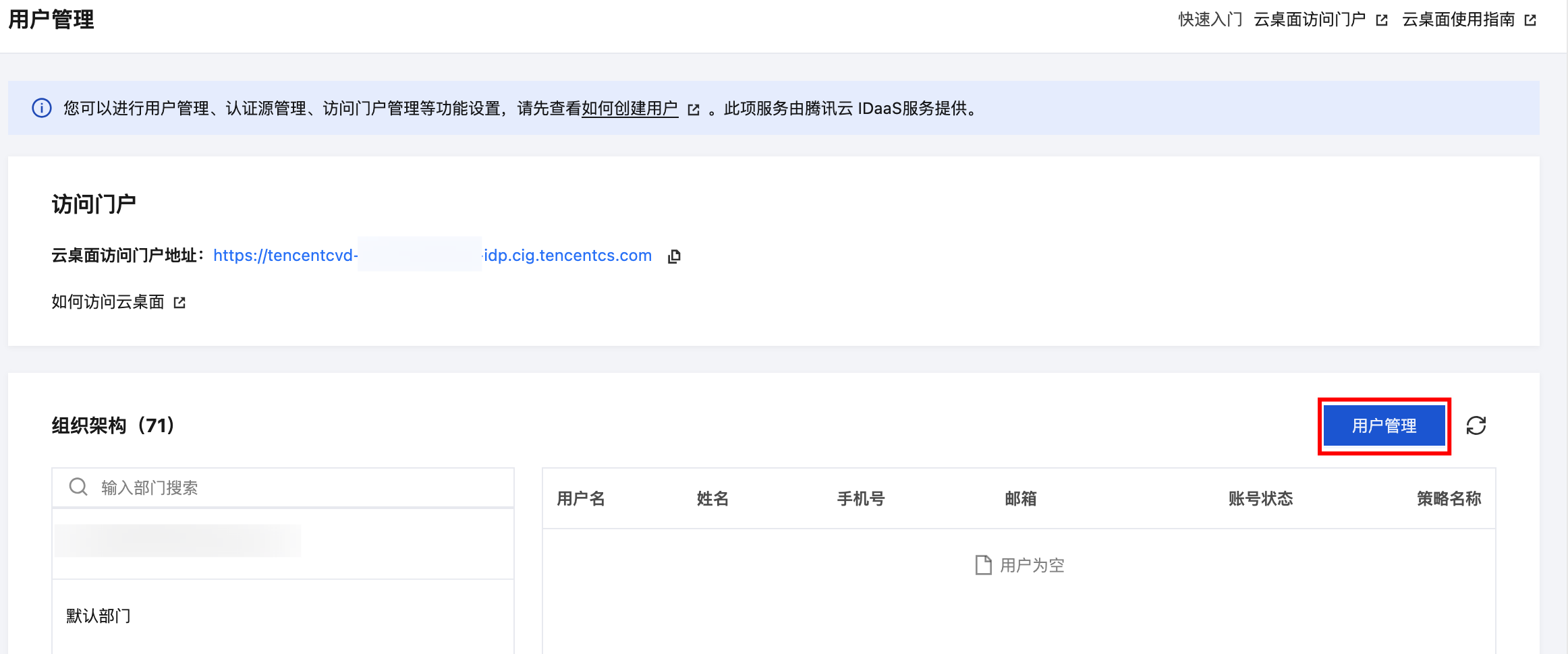 2. 在页面内单击列表右上角的用户管理,将跳转至腾讯云 IDaaS 界面。