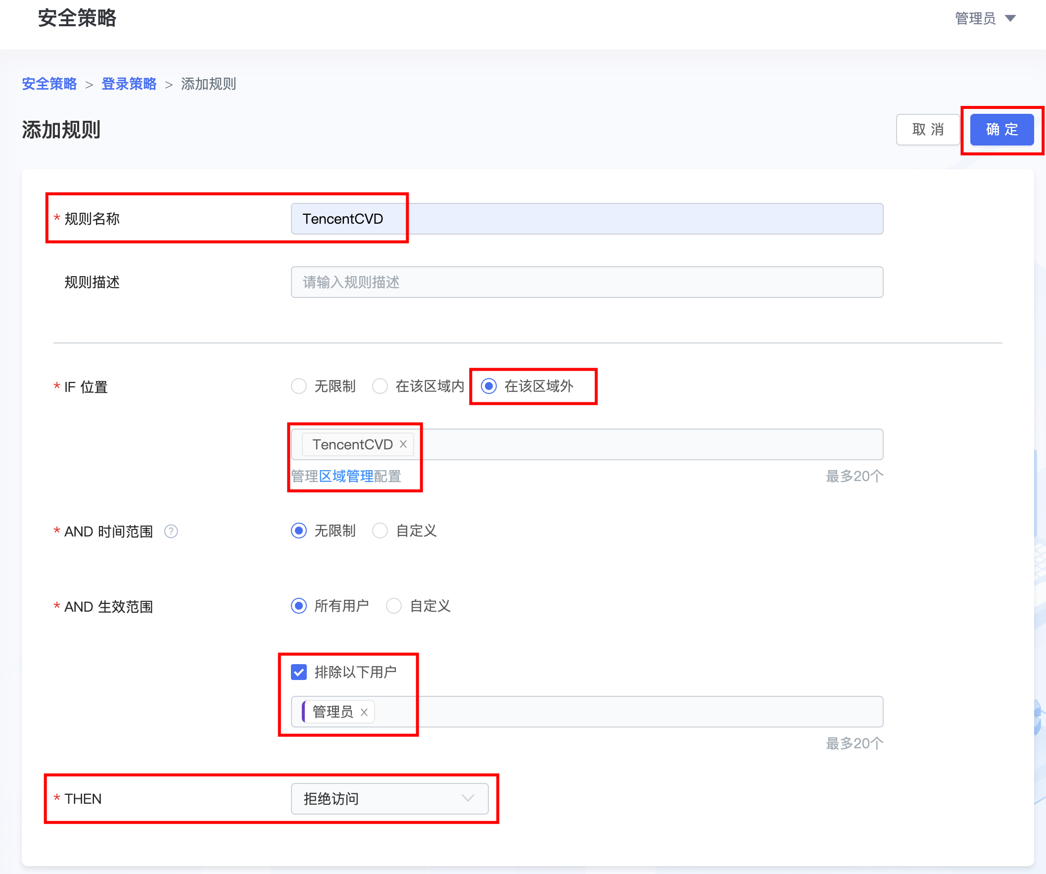 如果生效范围选择所有用户,必须勾选“排除以下用户”并排除管理员用户(搜索管理员、Administrator 或腾讯云 UIN)。若无法排除管理员,请将生效范围改为"自定义",然后选择需要生效的用户。否则,管理员将无法进入用户管理页面进行用户管理相关工作。
