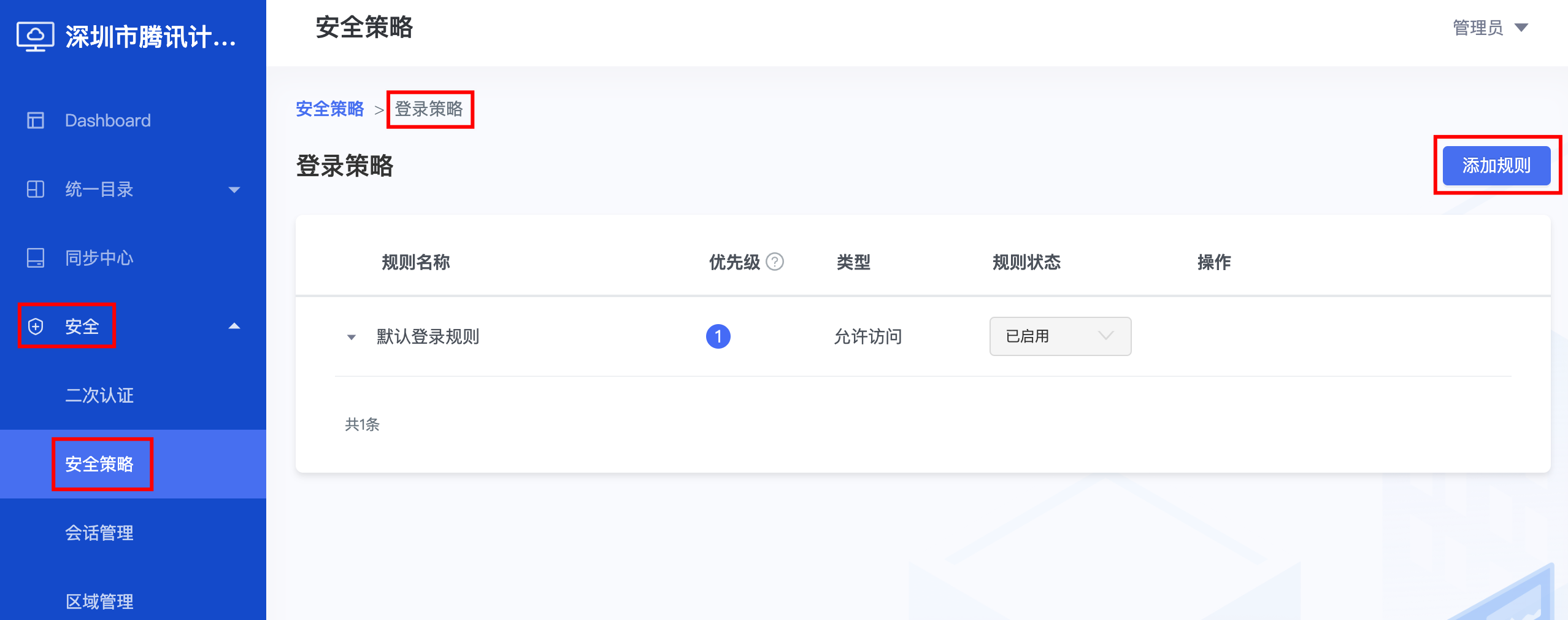 5. 选择安全 > 安全策略,单击登录策略进入页面后,继续单击添加规则。