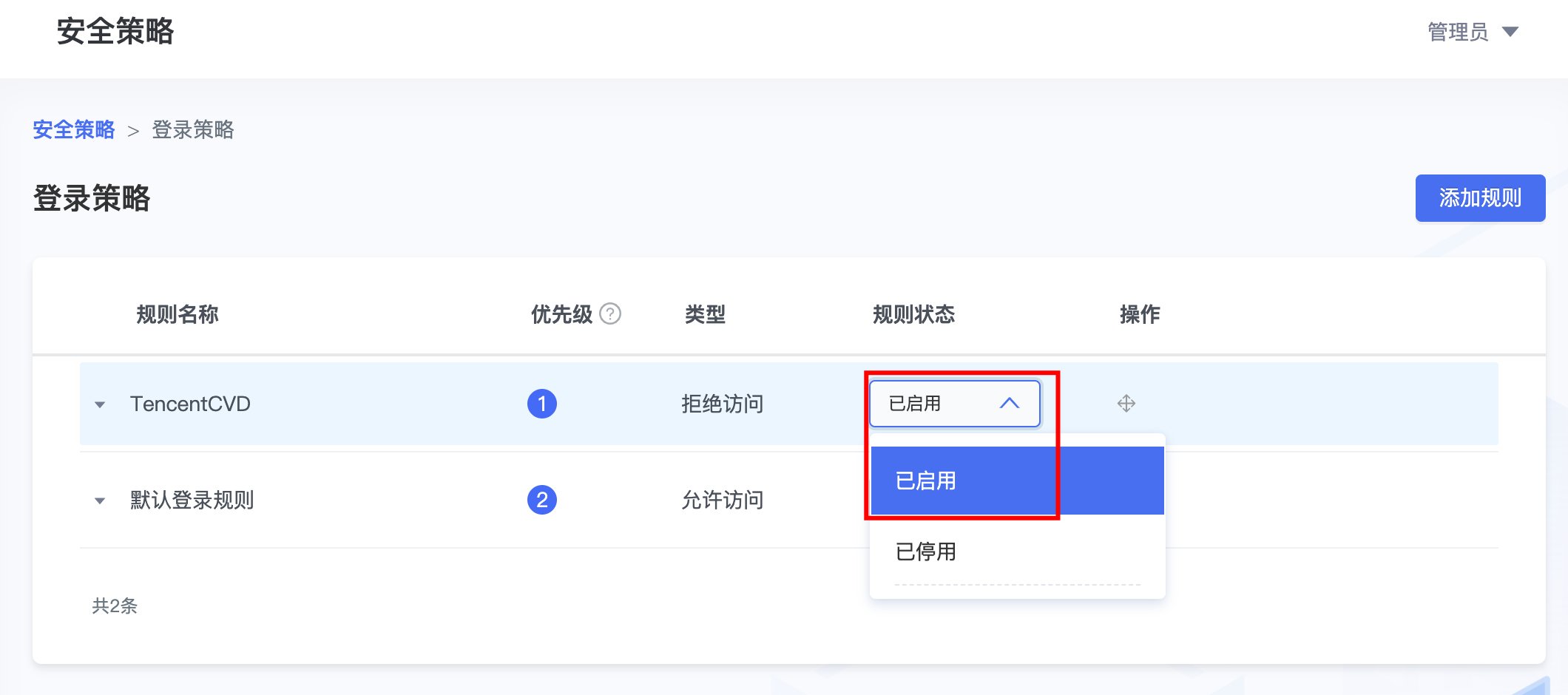 7. 添加完登录规则后,规则状态默认为“已停用”,需切换为“已启用”来启用登录策略。