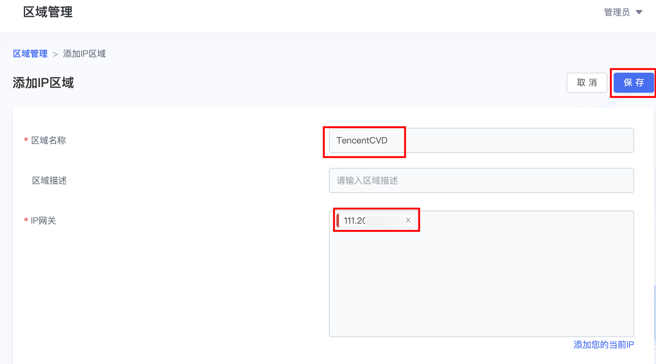 4. 输入区域名称和区域描述,在 IP 网关栏填写需要限制的公网 IP。如需限制多个公网 IP,请全部填写。填写完成后单击保存。