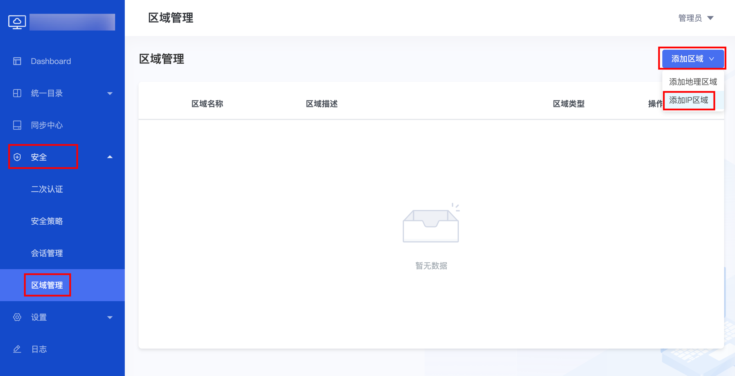 3. 选择安全 > 区域管理,然后依次单击添加区域 > 添加IP区域。
