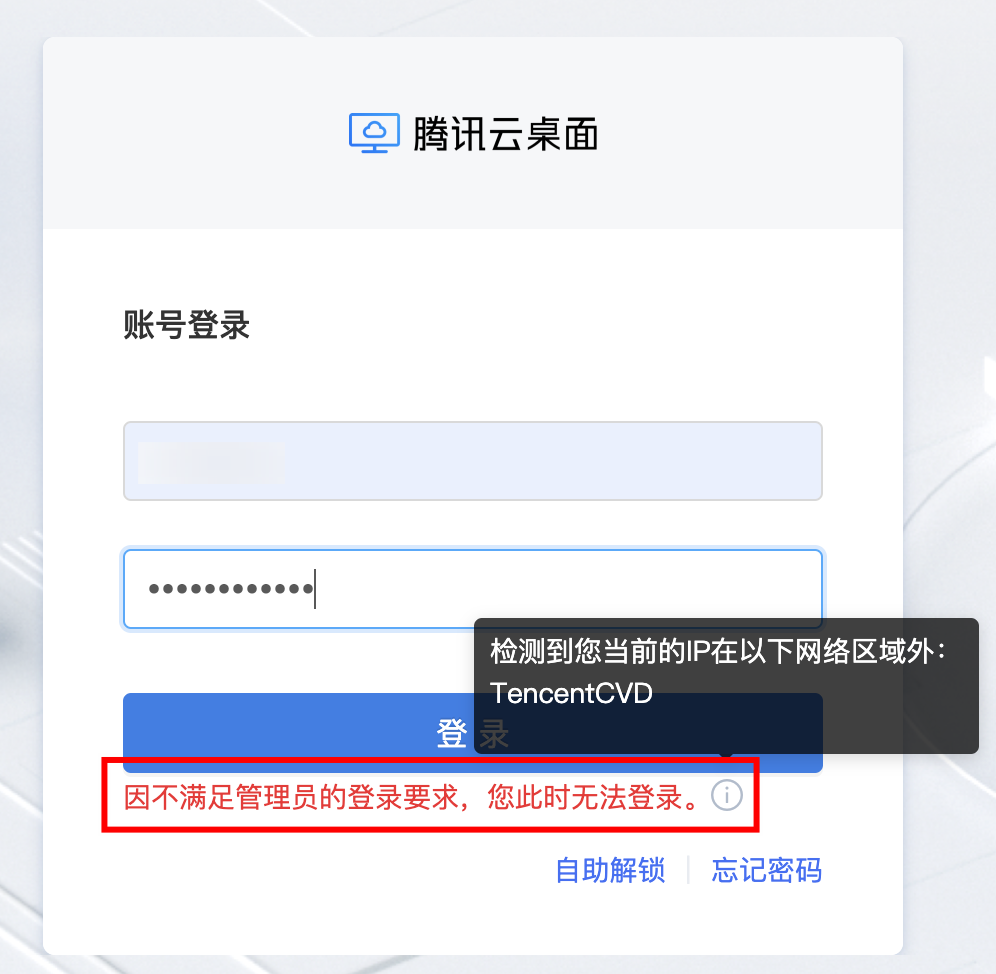 在设定的 IP 区域外登录云桌面访问门户,提示“因不满足管理员的登录要求,您此时无法登录。”,拒绝此次用户登录。