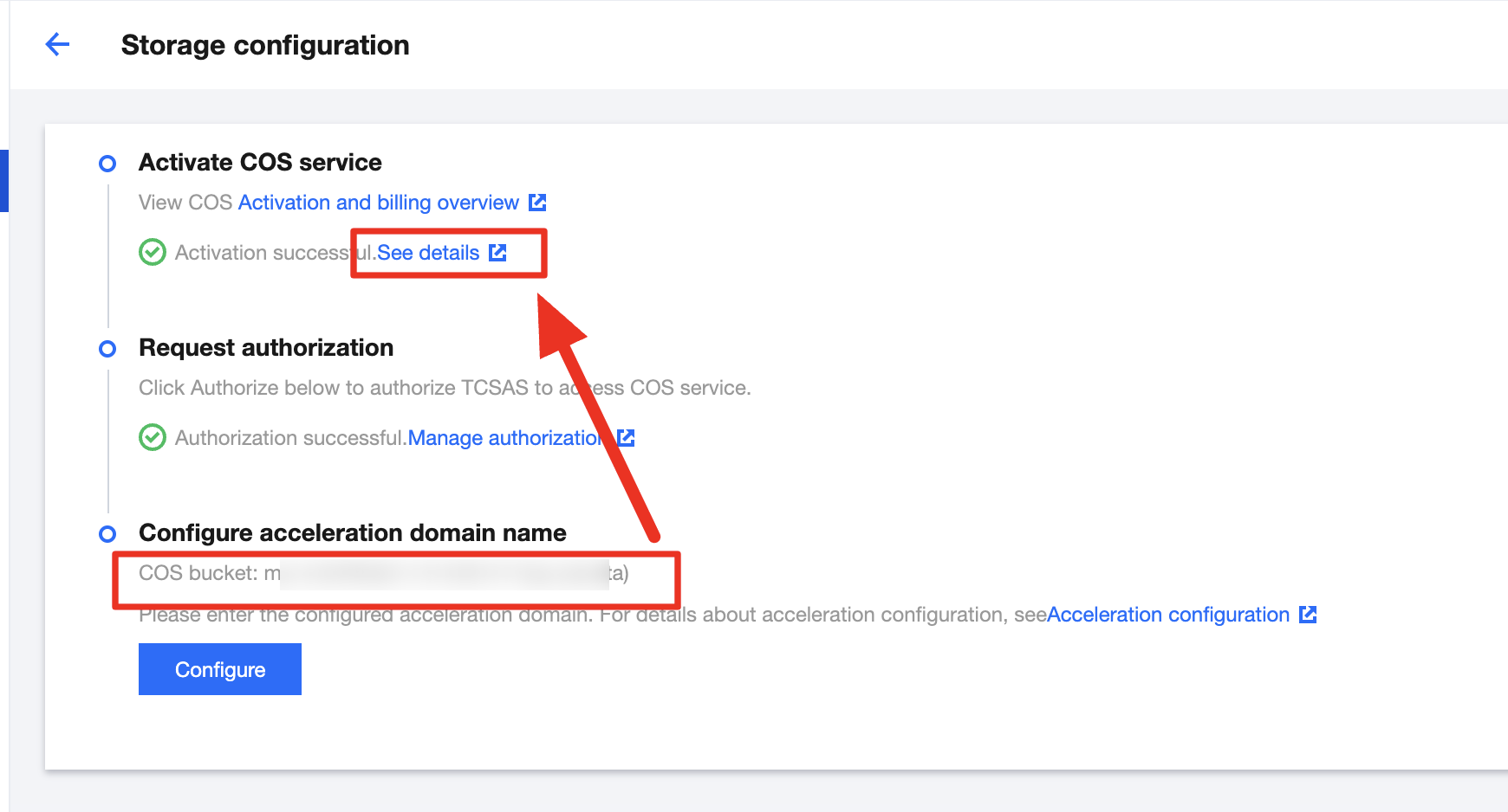 在 TCSAS 存储配置页面中,复制加速域名配置下方的“COS bucket”,再点击开通 COS 服务下面的“see details”,前往COS 控制台。 进入 COS 配置页面,点击左侧菜单“存储桶列表”,找到对应的存储桶( 可以使用上图中的 COS bucket 在右侧搜索框中搜索)。