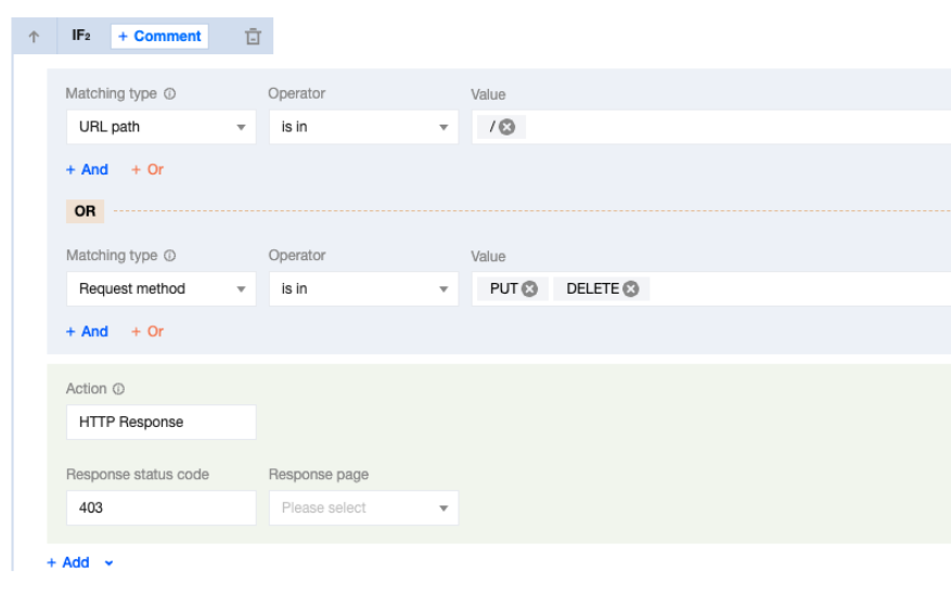 为保障您的数据安全,避免加速域名 PUT 及 DELETE 安全漏洞,我们建议您通过 EO 配置中的 web 防护对 PUT 和 DELETE 进行 block 操作。